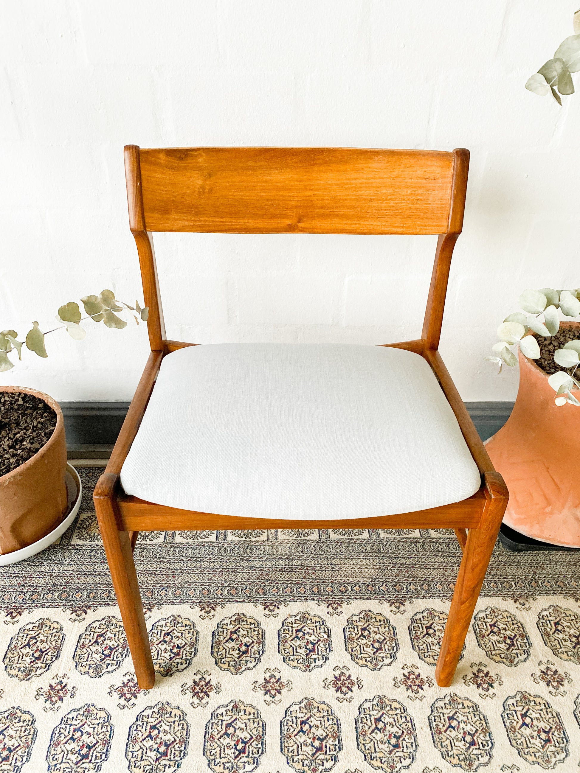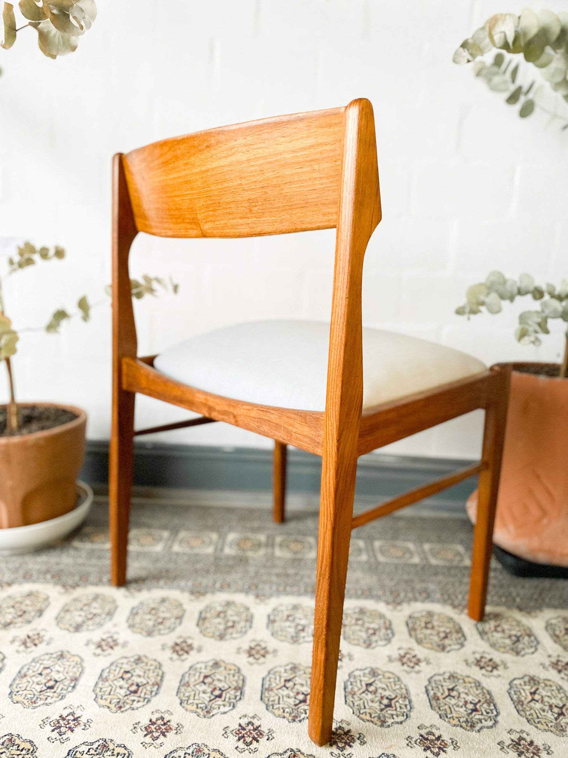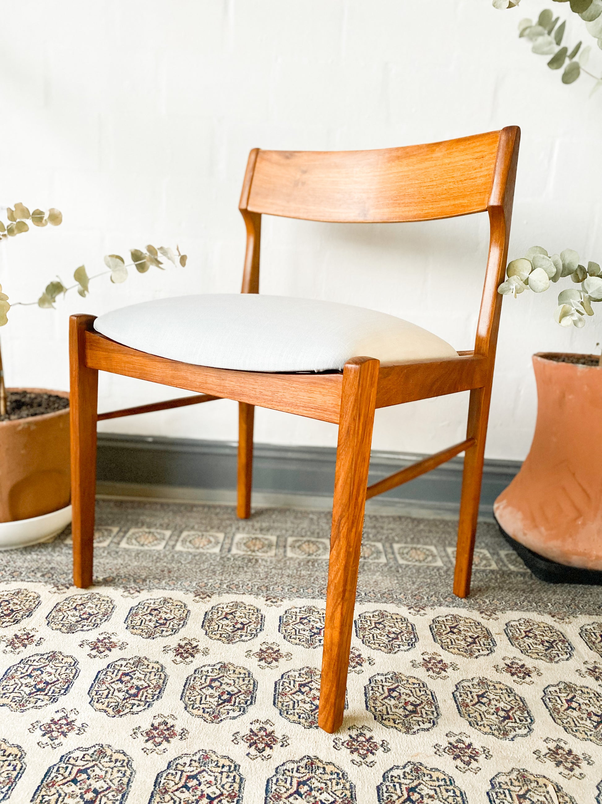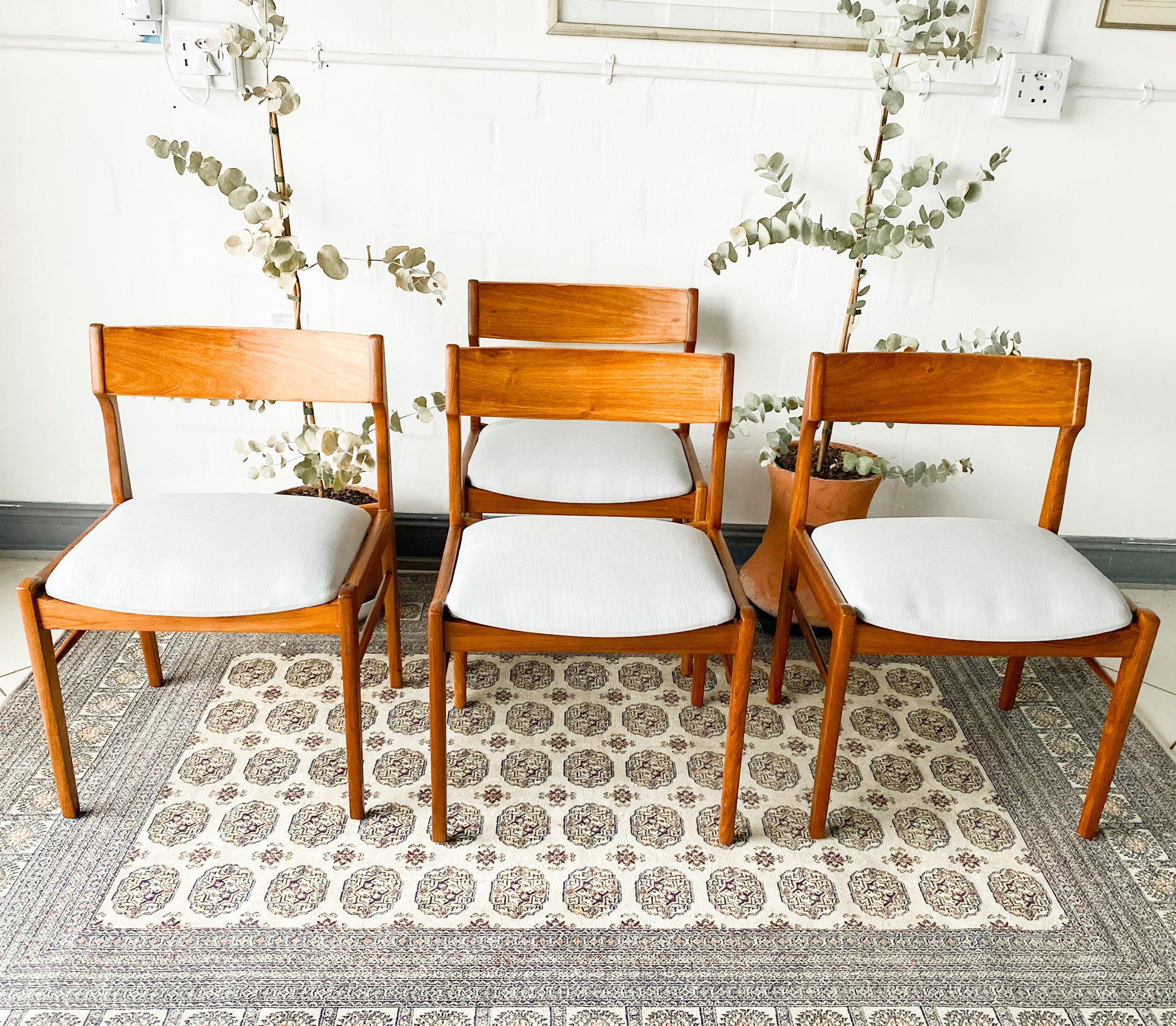 Enhance your dining area with this exquisite collection of four dining chairs from the renowned UK brand, Greaves and Thomas. The chairs boast a sleek and modern design with clean lines, accentuated by the bright and inviting warm wood grain finish, sure to elevate the aesthetic of any room they're placed in. Furthermore, the chairs have been expertly reupholstered in a stunning light grey fabric, and come with new cushioning to ensure both comfort and style.
