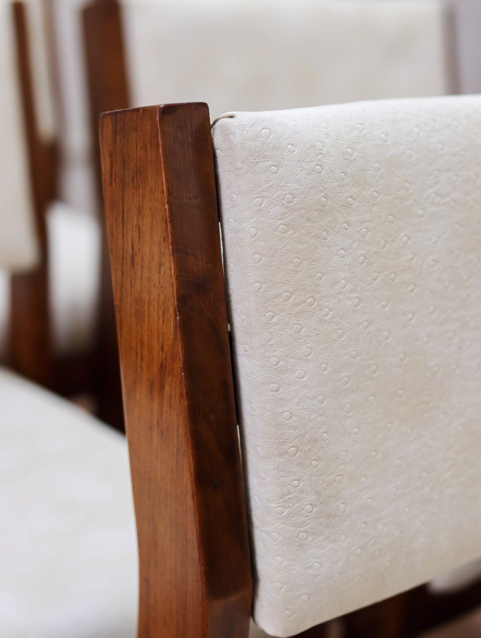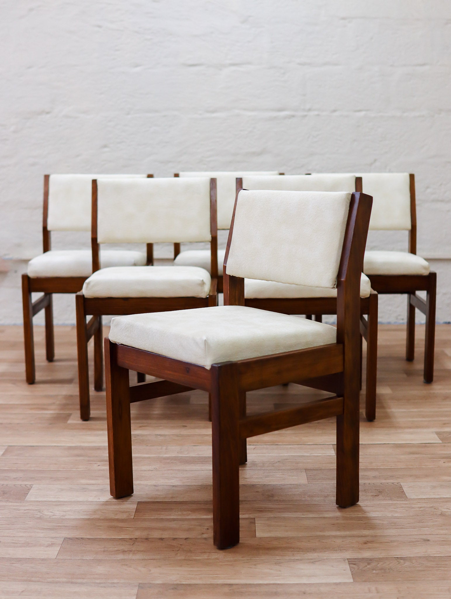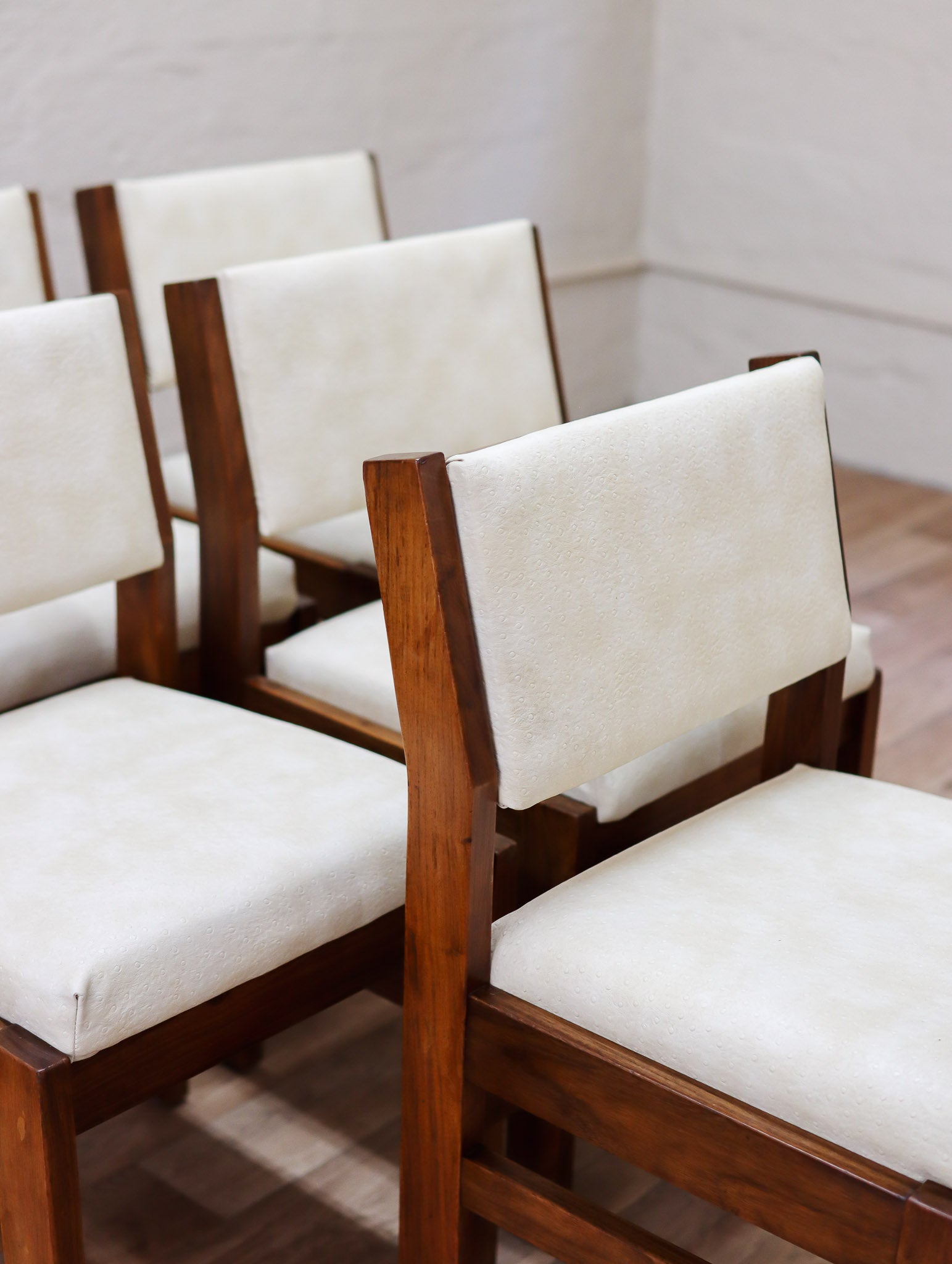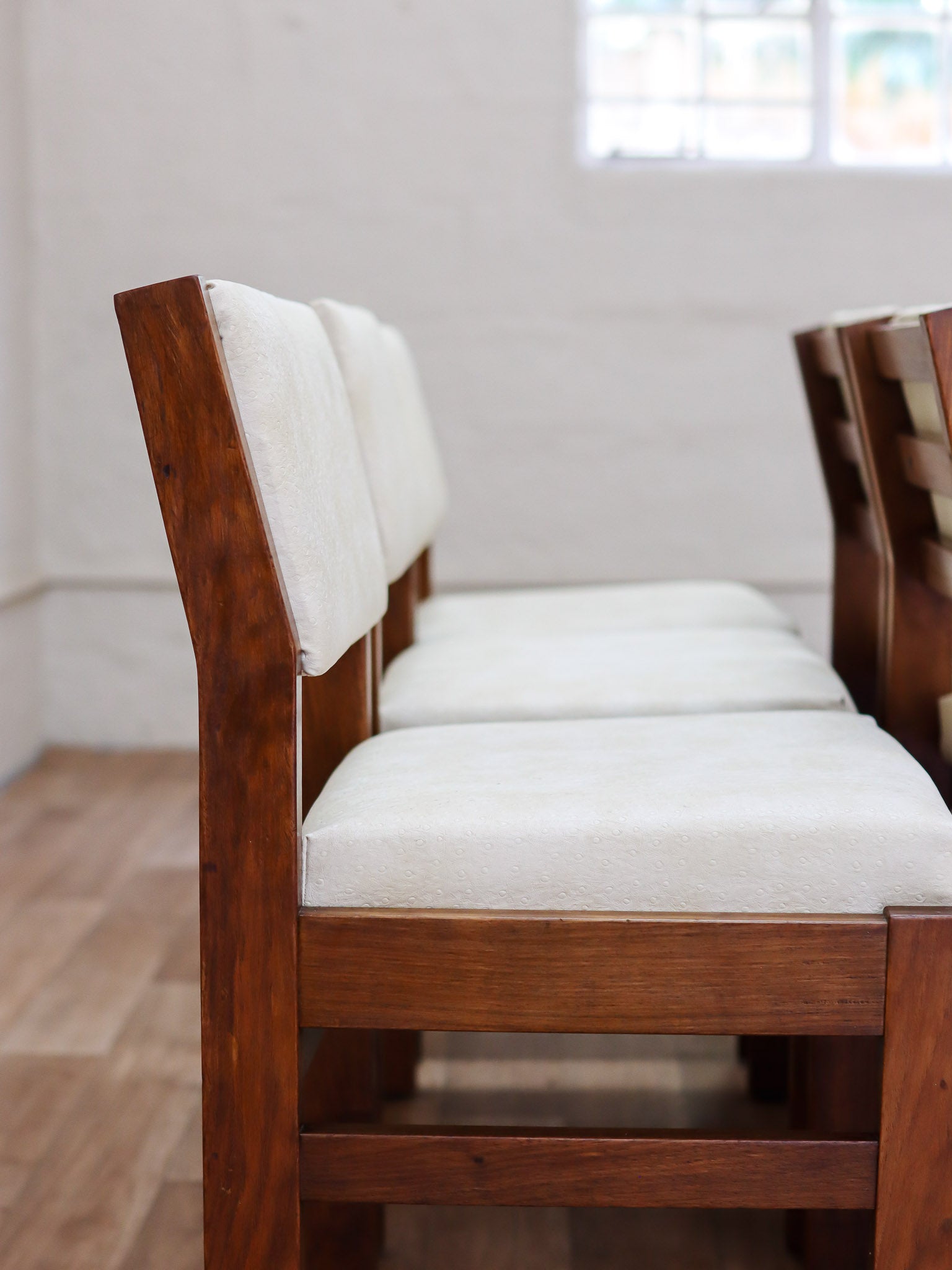 Set of six mid-century dining chairs crafted from richly toned kiaat wood. Upholstered in a patterned cream vinyl, the seats and backrests have a clean, modern look that pairs effortlessly with a variety of interiors, from classic to contemporary. The chairs are sturdy, well-crafted, and in great condition, making them an ideal choice for a dining space that’s both functional and design-forward. A versatile set ready to become a standout feature in your home.