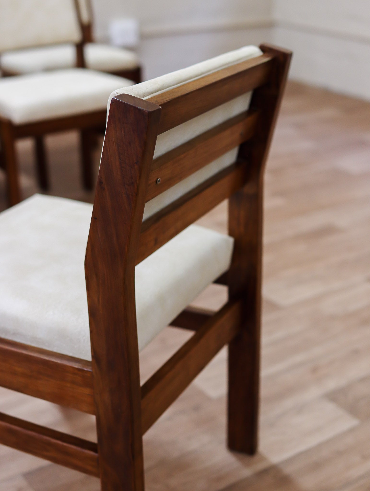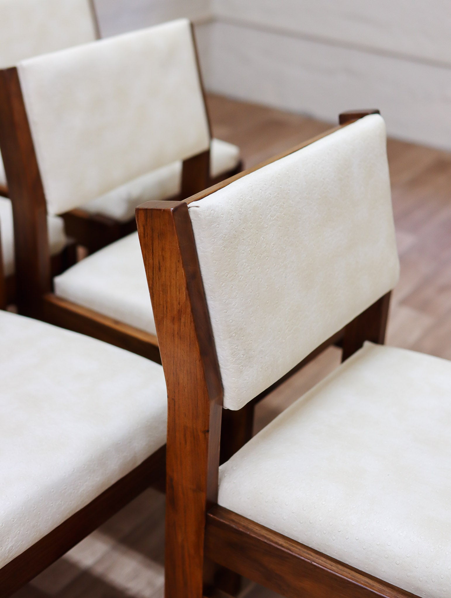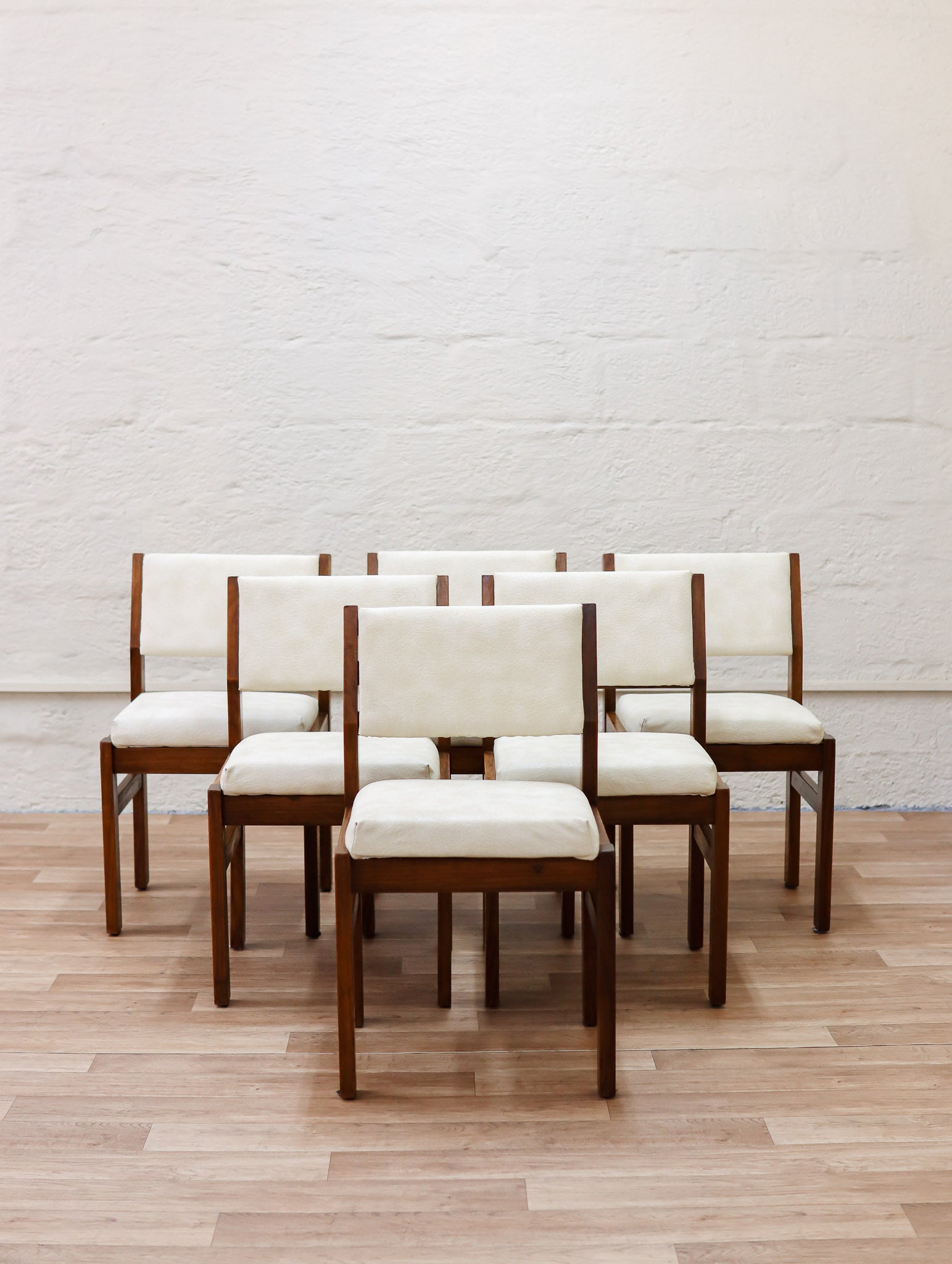 Set of six mid-century dining chairs crafted from richly toned kiaat wood. Upholstered in a patterned cream vinyl, the seats and backrests have a clean, modern look that pairs effortlessly with a variety of interiors, from classic to contemporary. The chairs are sturdy, well-crafted, and in great condition, making them an ideal choice for a dining space that’s both functional and design-forward. A versatile set ready to become a standout feature in your home.