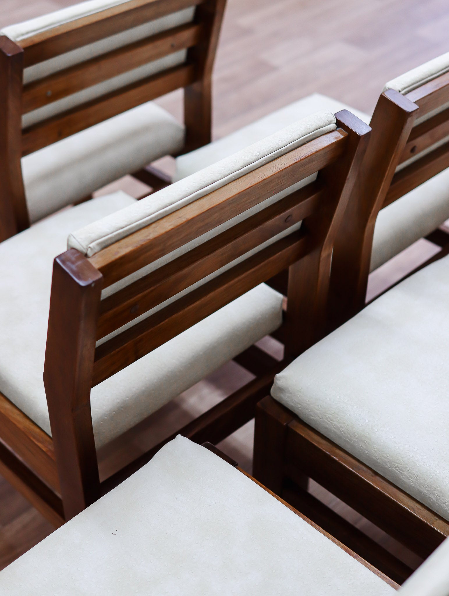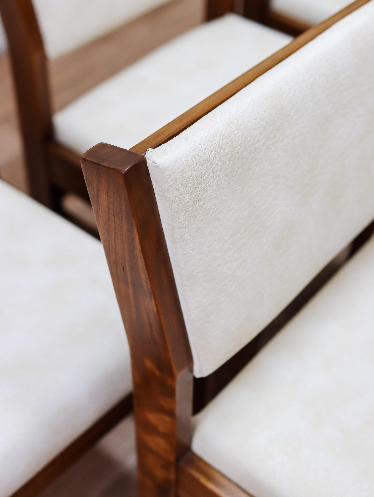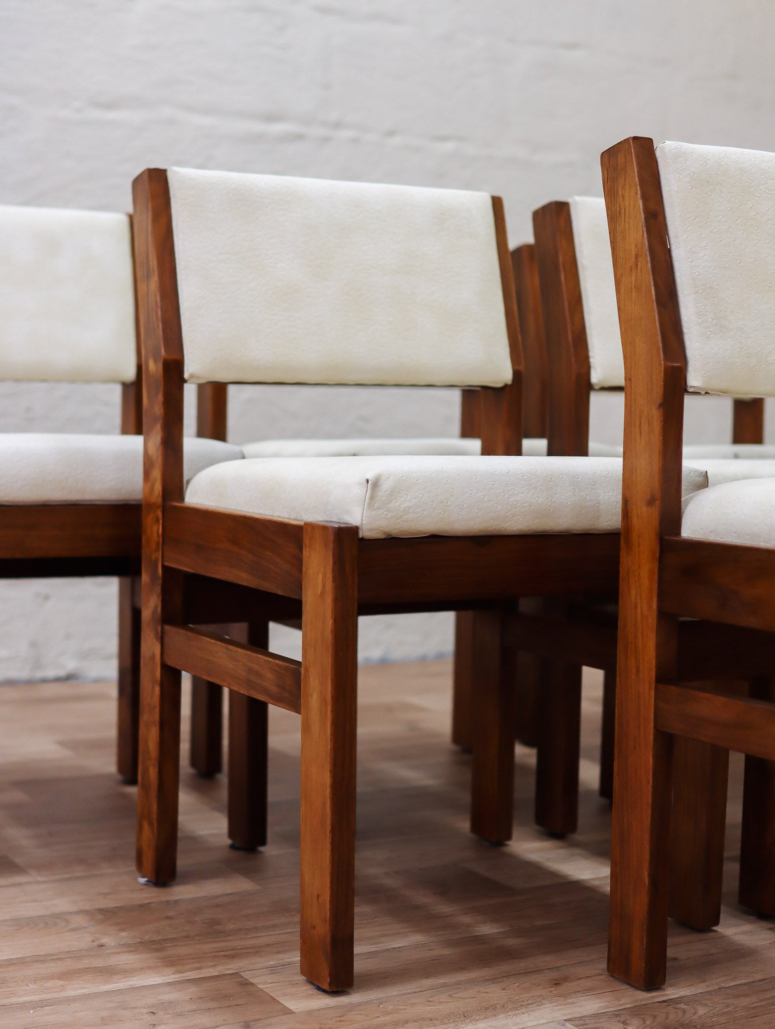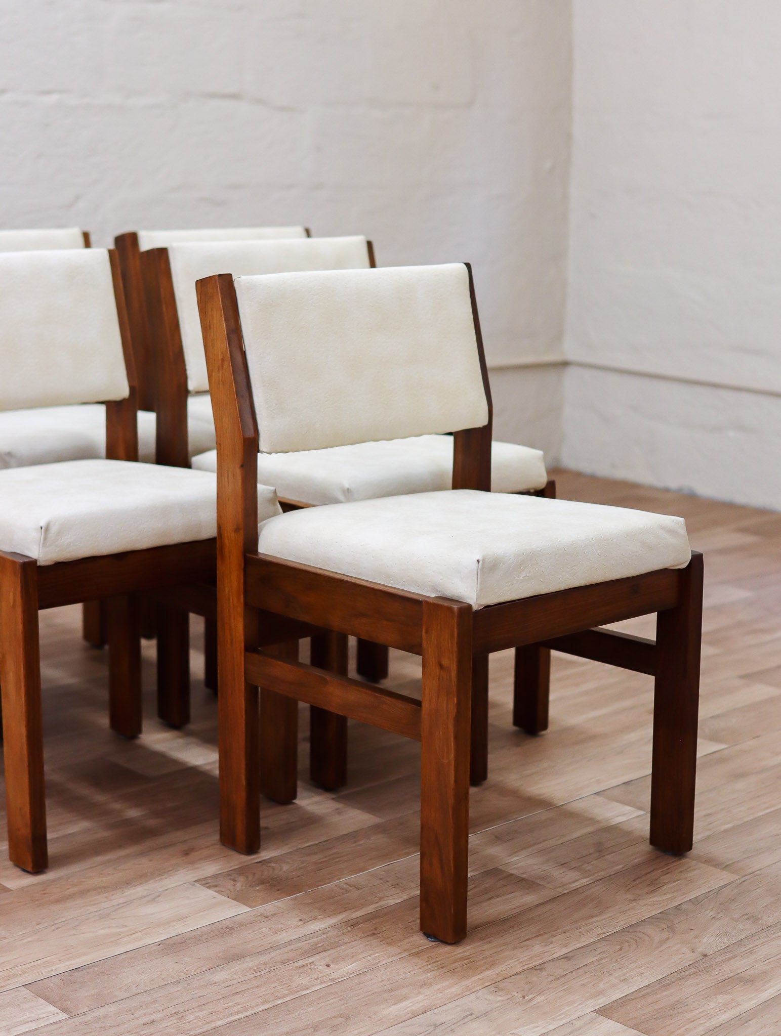 Set of six mid-century dining chairs crafted from richly toned kiaat wood. Upholstered in a patterned cream vinyl, the seats and backrests have a clean, modern look that pairs effortlessly with a variety of interiors, from classic to contemporary. The chairs are sturdy, well-crafted, and in great condition, making them an ideal choice for a dining space that’s both functional and design-forward. A versatile set ready to become a standout feature in your home.
