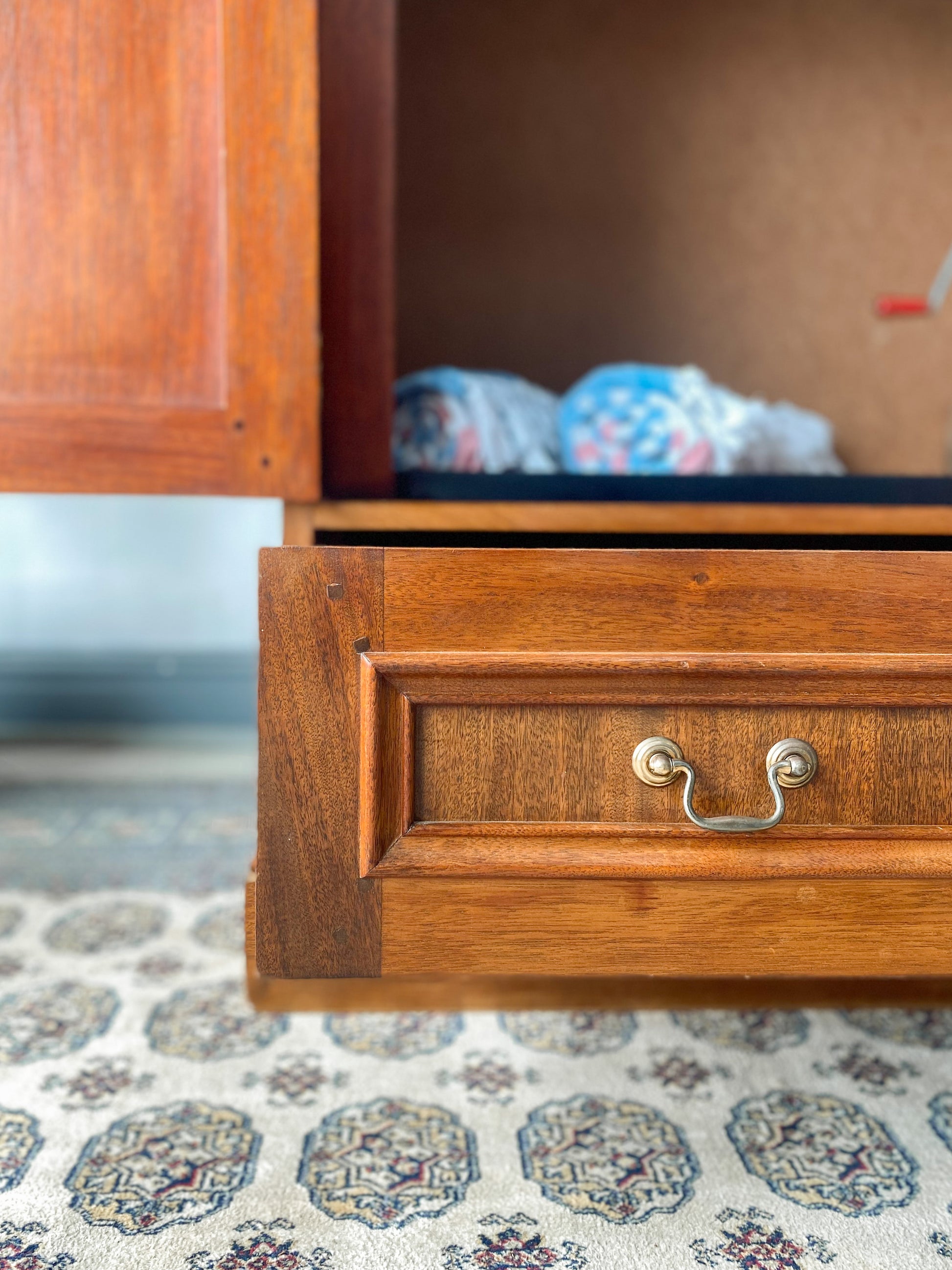 Beautiful Oak Cabinet featuring stunning carved wood detailing on the front and sides. This cabinet offers ample amount of space throughout its bottom drawer and cabinet space.