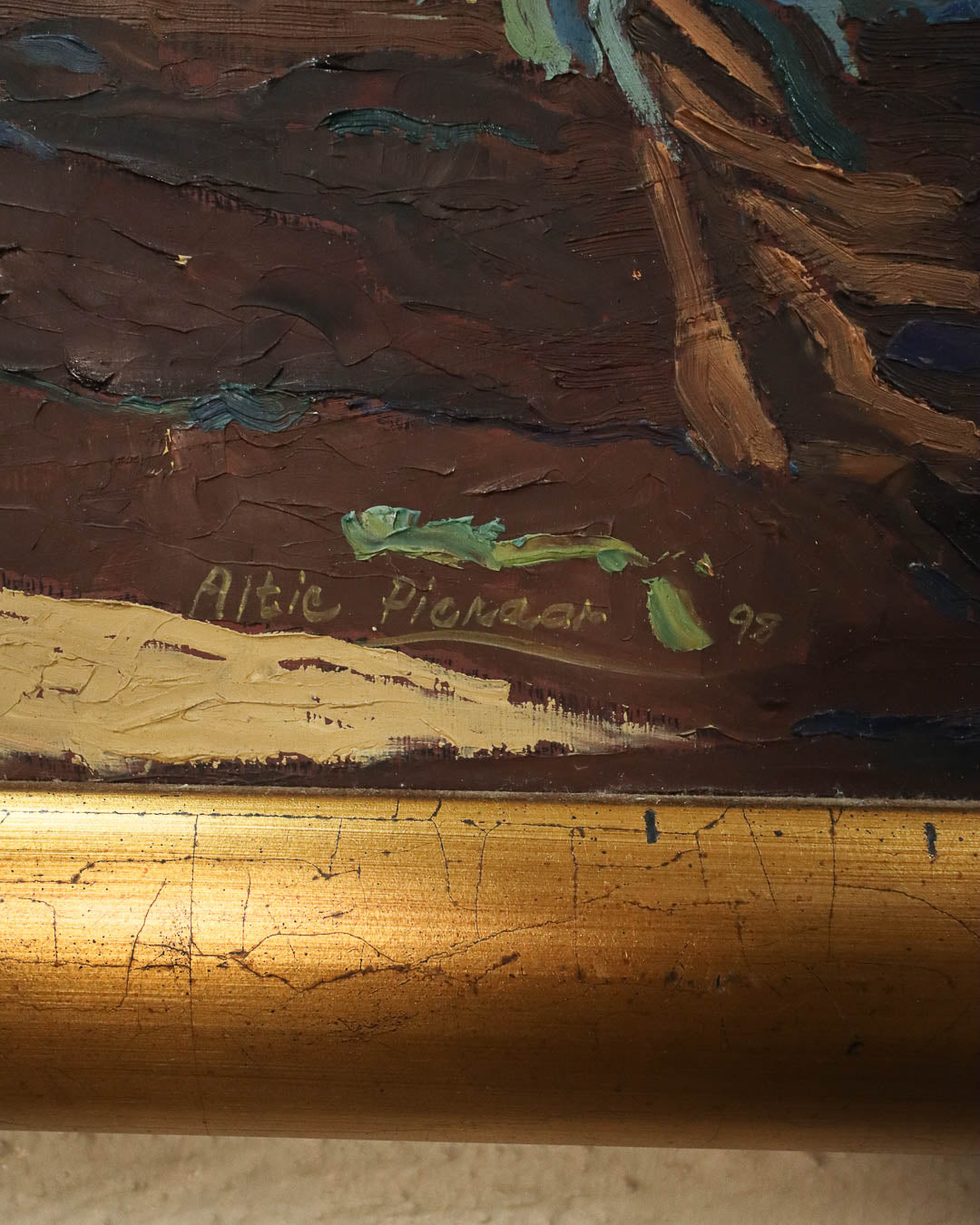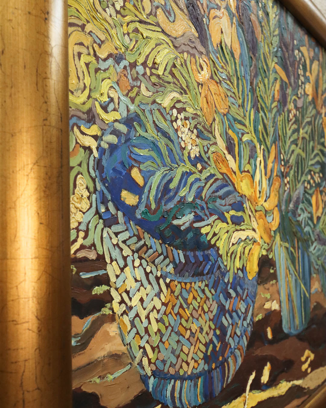 Beautiful original still life oil painting of vases with flowers and foliage in an expressive style somewhat reminiscent of Van Gogh. The bold brushstrokes add movement and texture, with warm hues complemented by a thick golden frame. By a South African artist, signed ‘Altie Pienaar ‘98’. 84cm x 70cm.