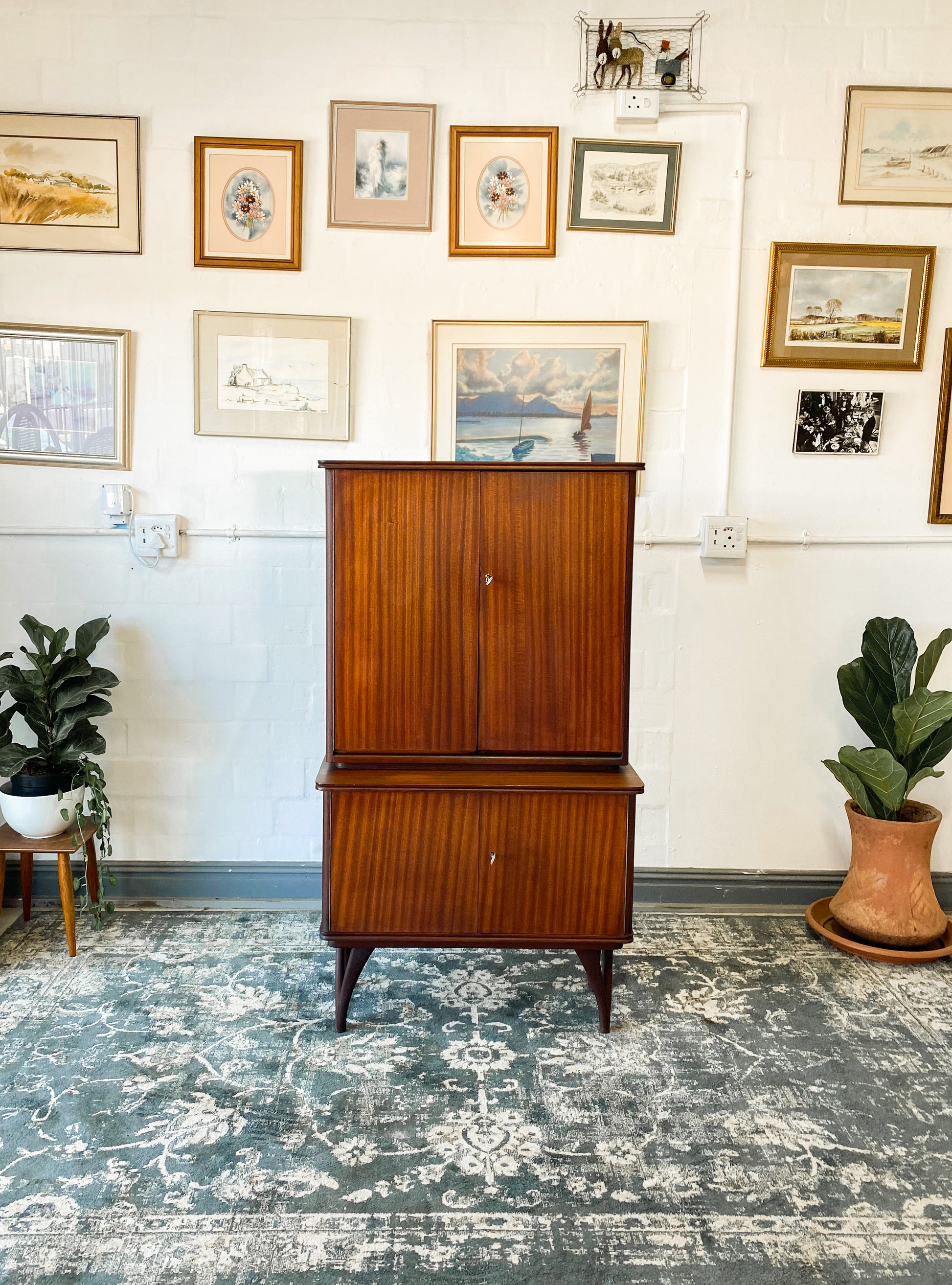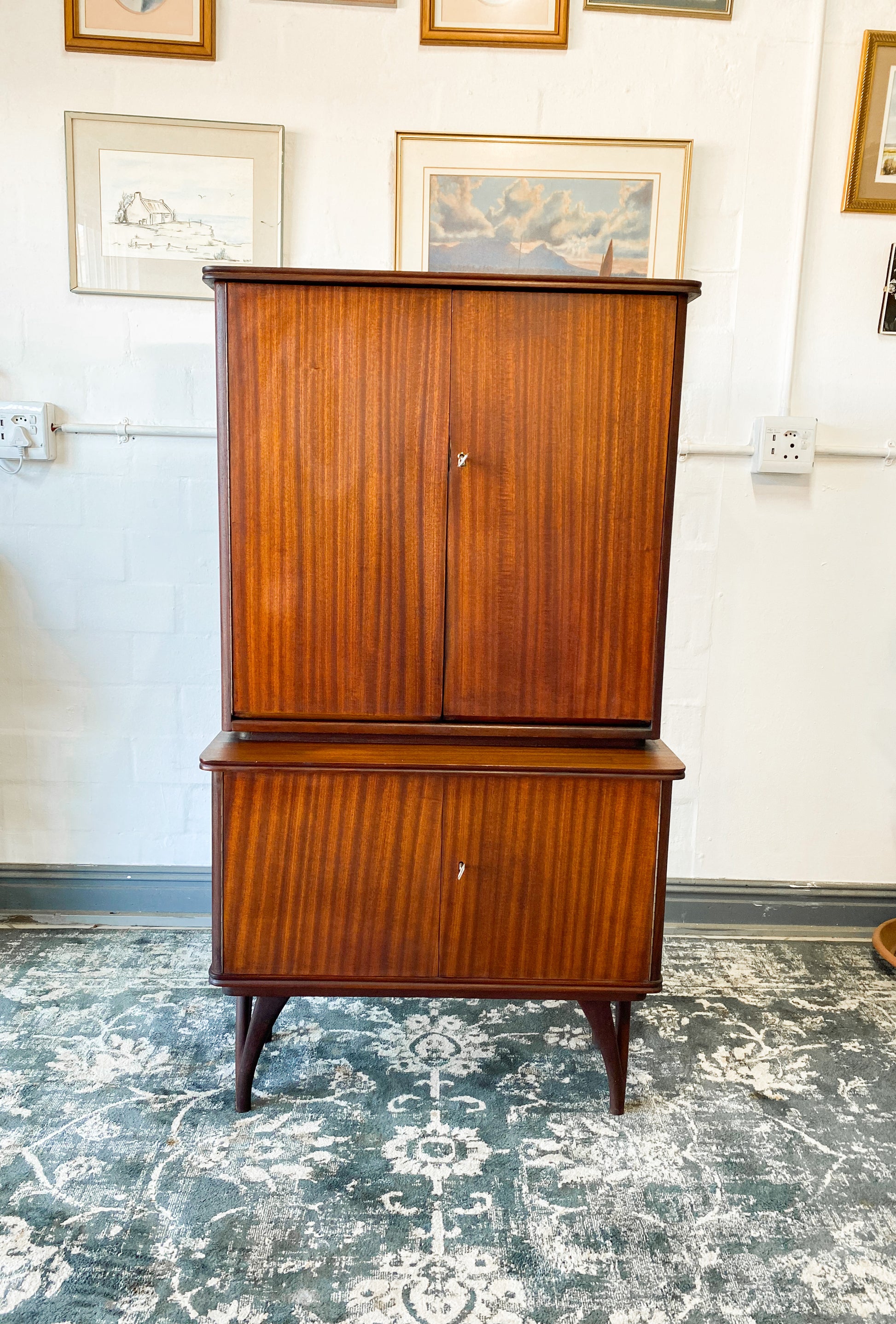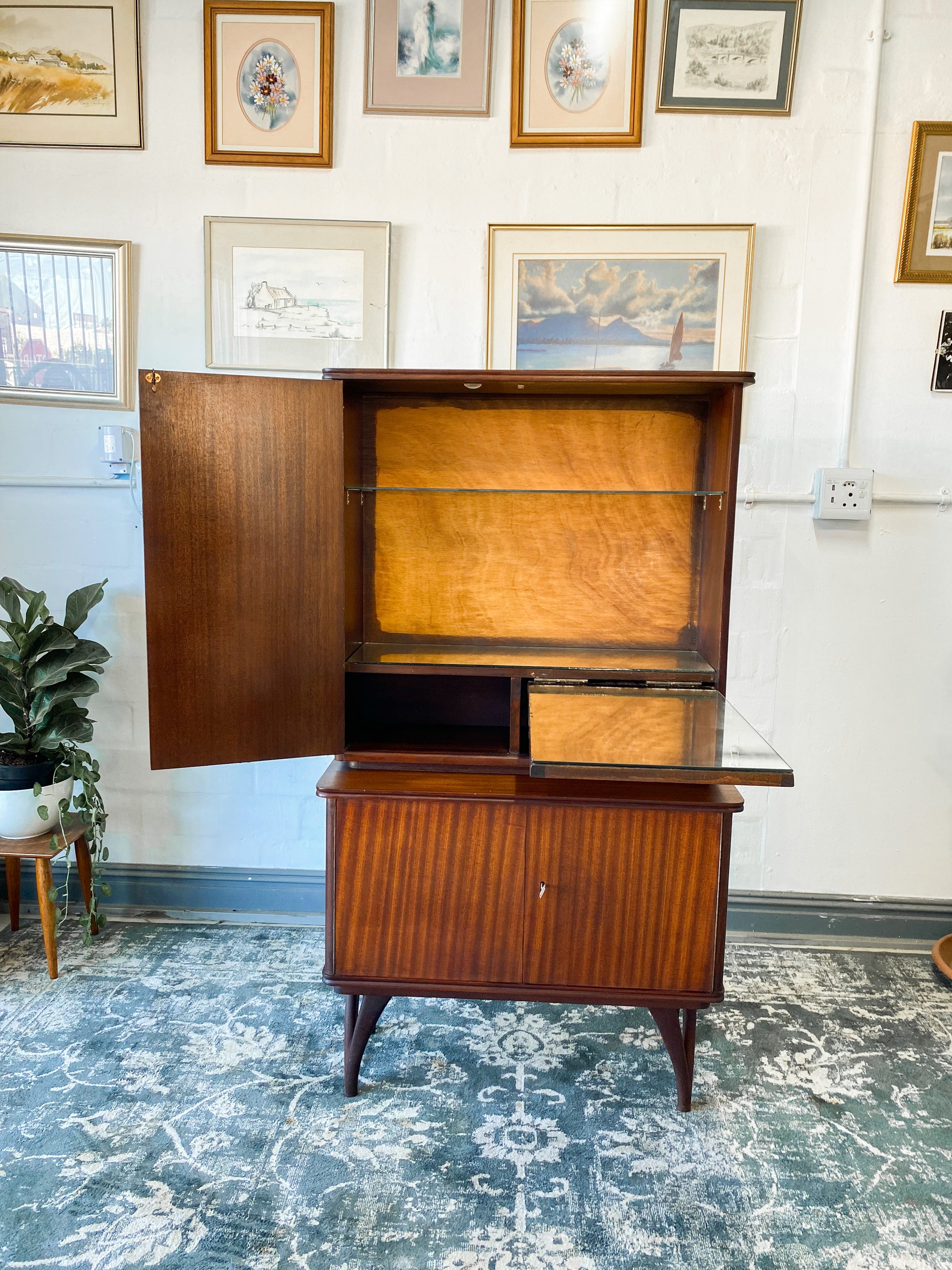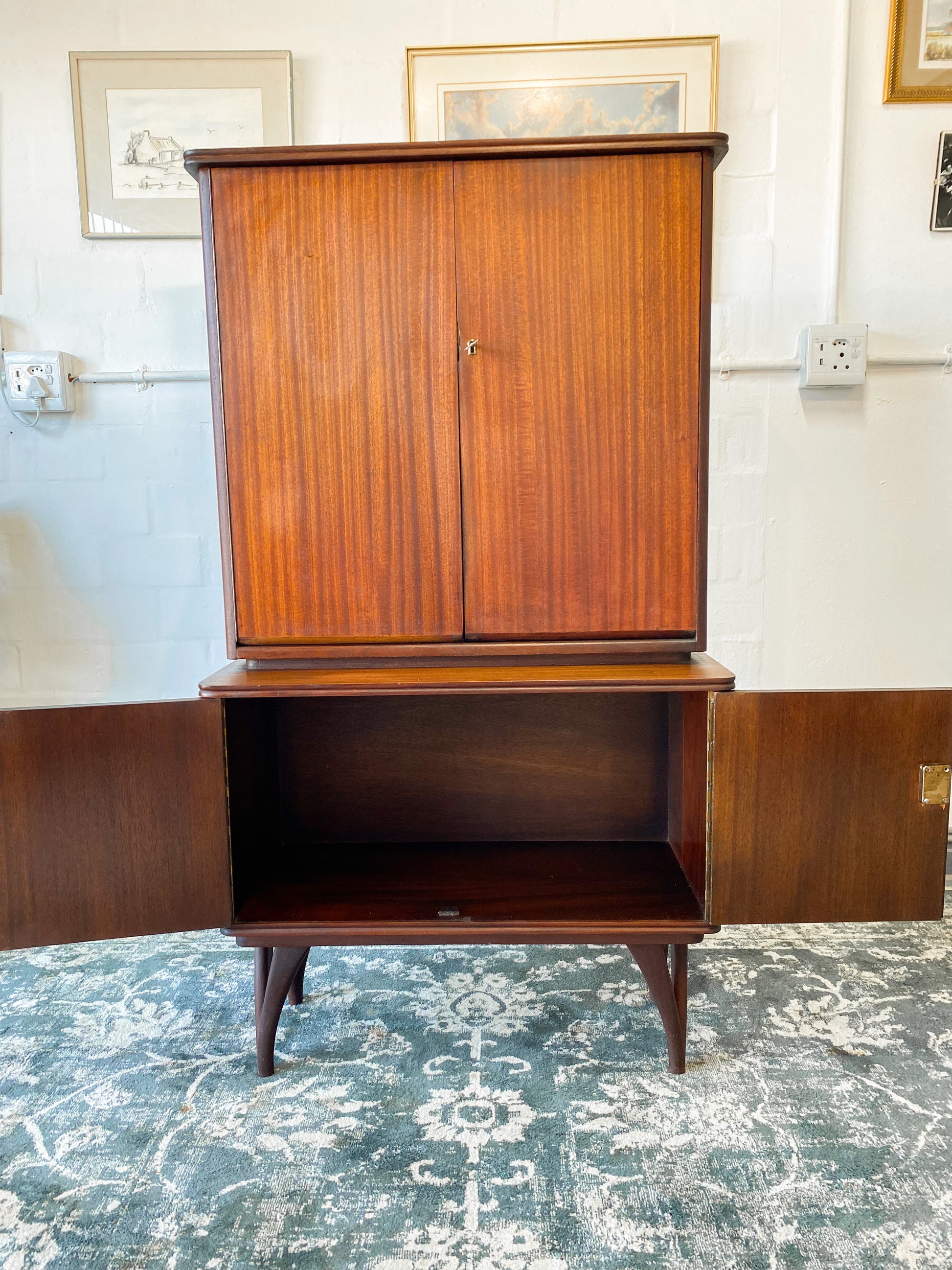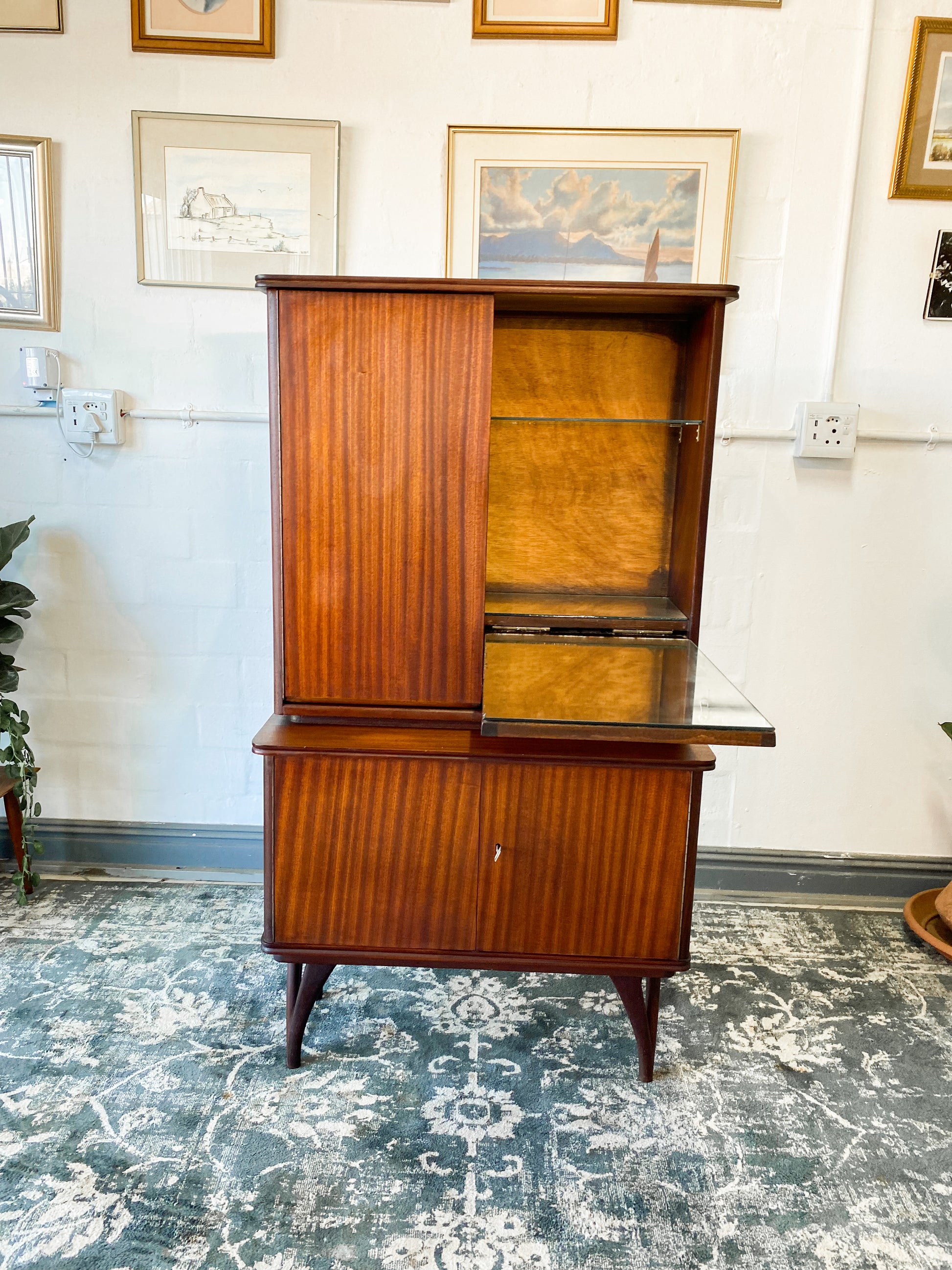 The bottom area has no inside shelves which are great for bottles etc. It still has its original 2 keys. A beautiful piece to own for years to come.