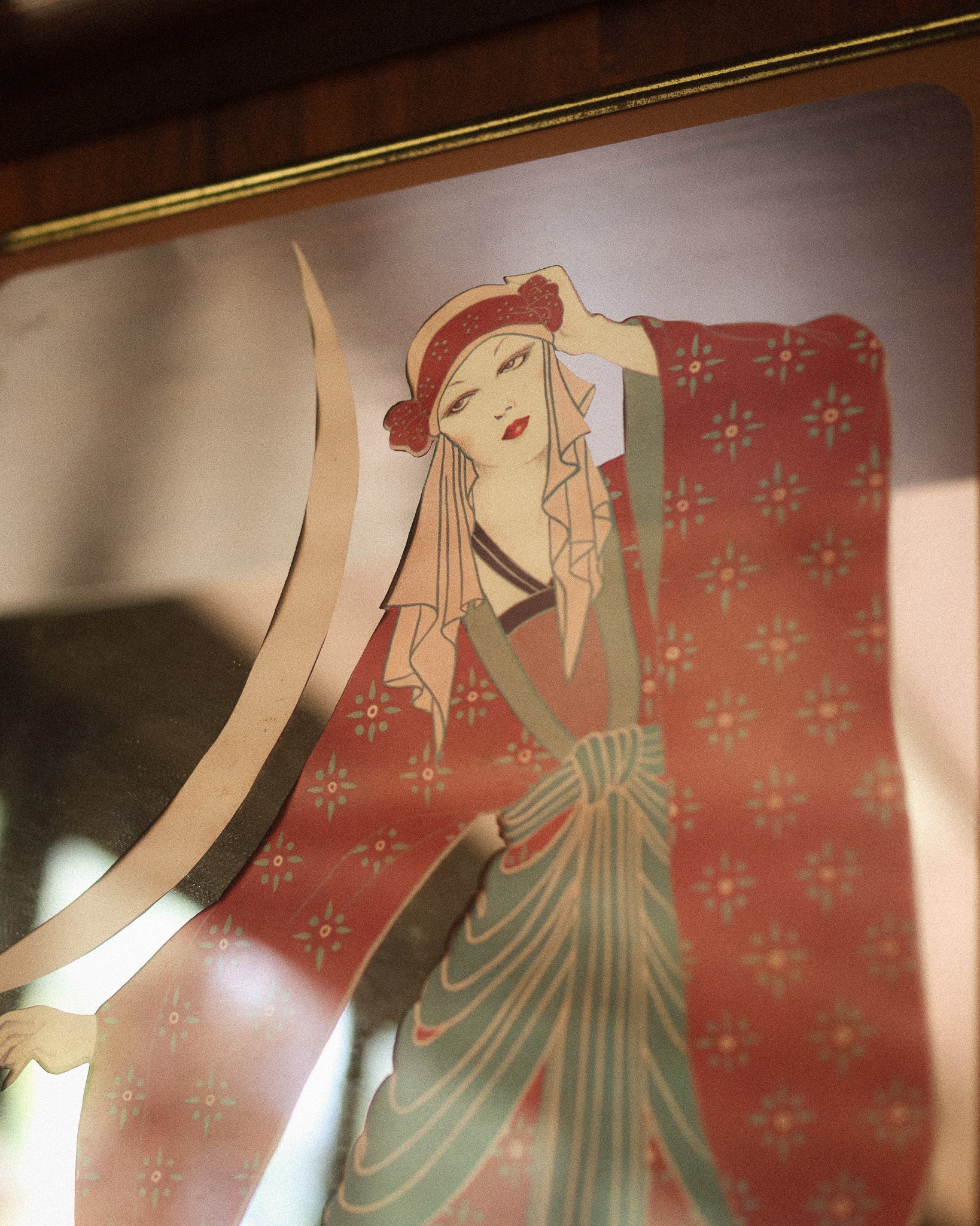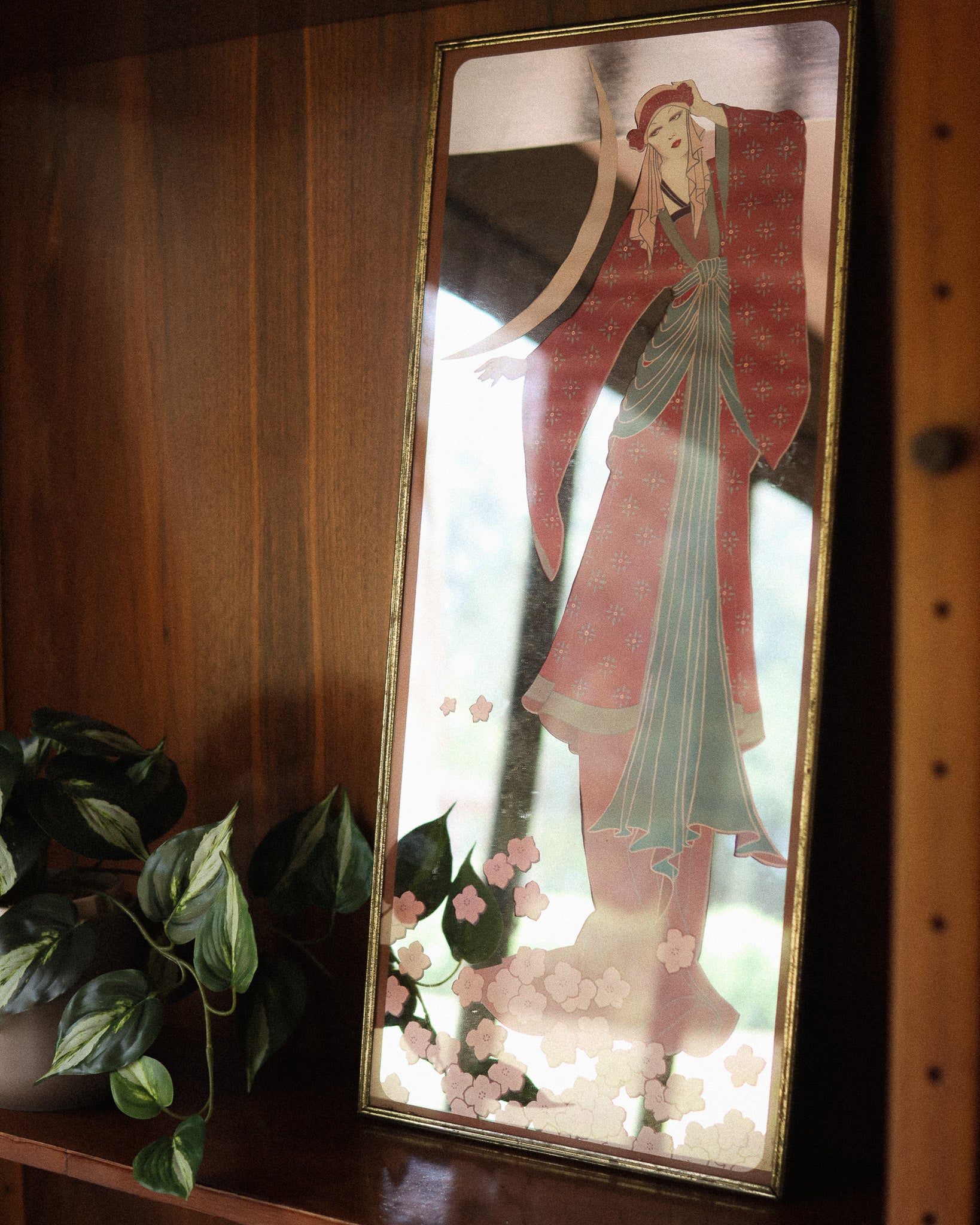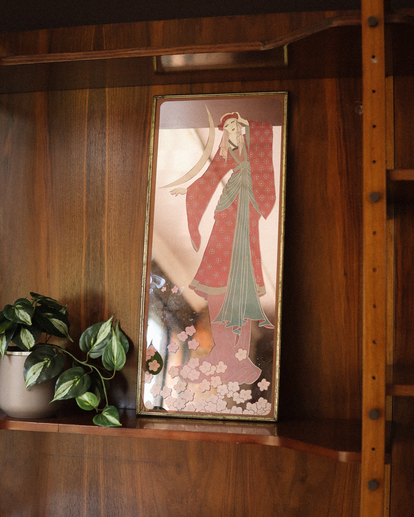 Unique framed mirror with a print of Lillian Shao’s 1978 ‘Power Song’, made in Japan. The worn golden frame adds to it’s vintage character, ideal for hanging in an entryway or hallway.
