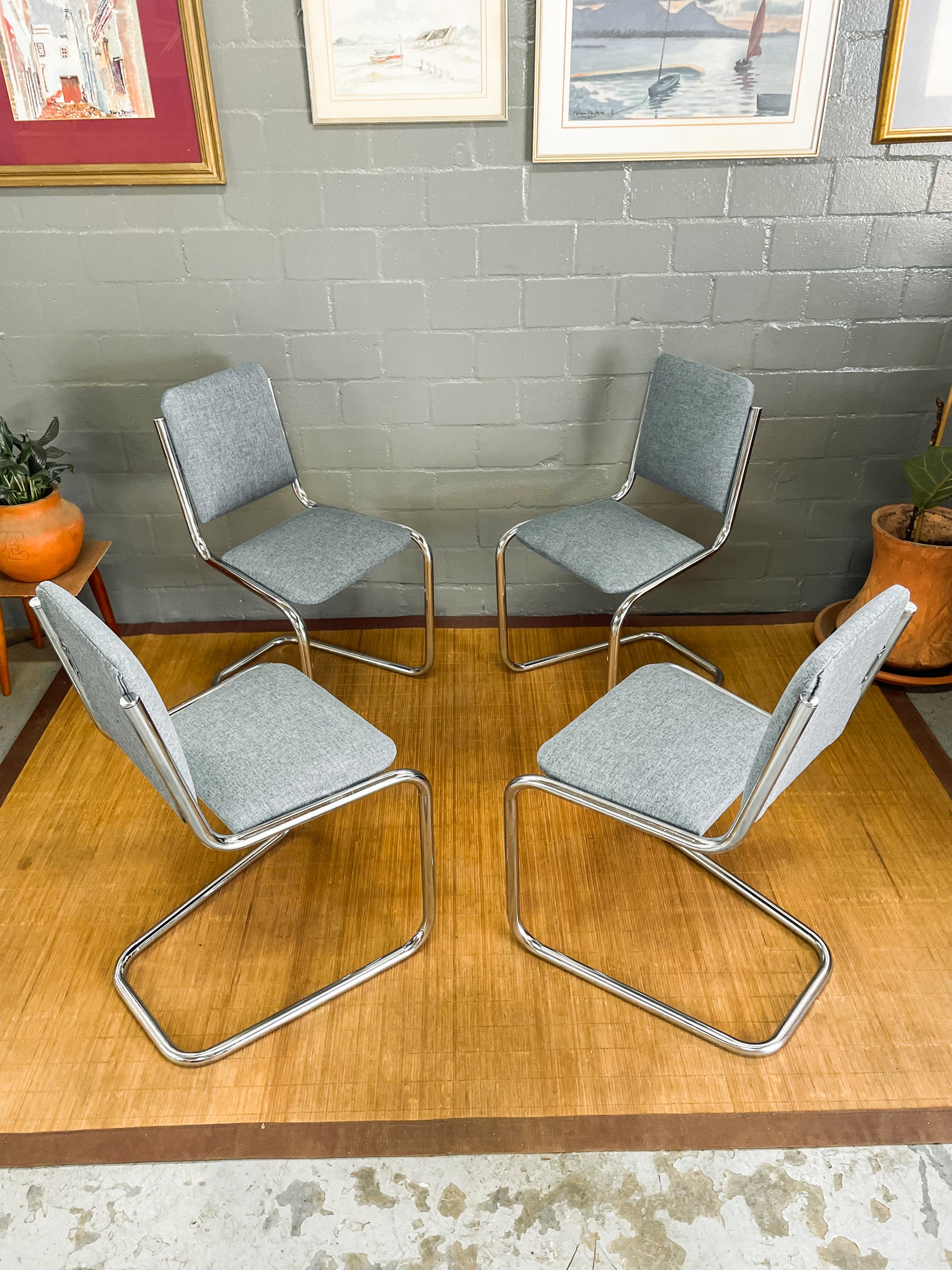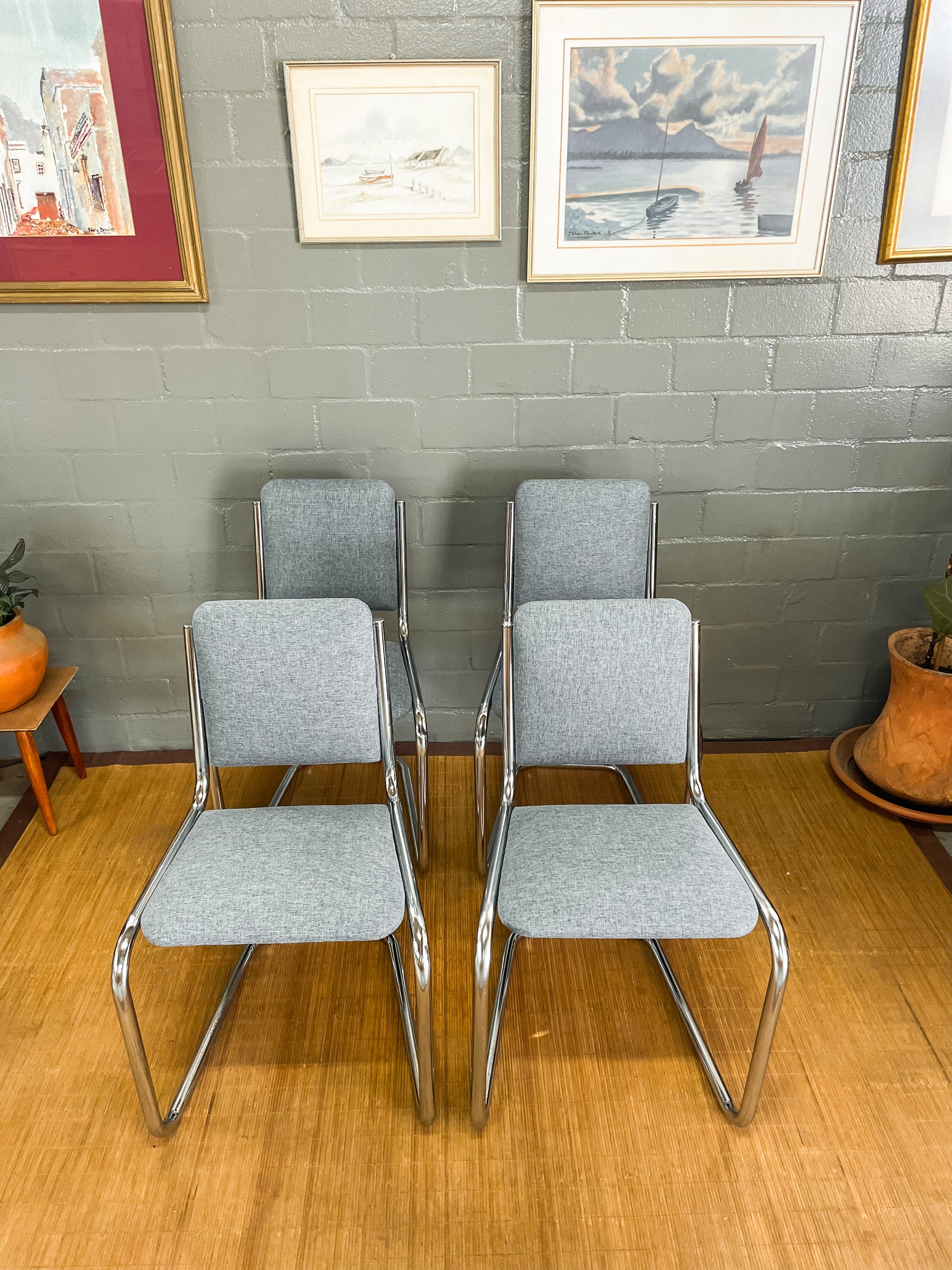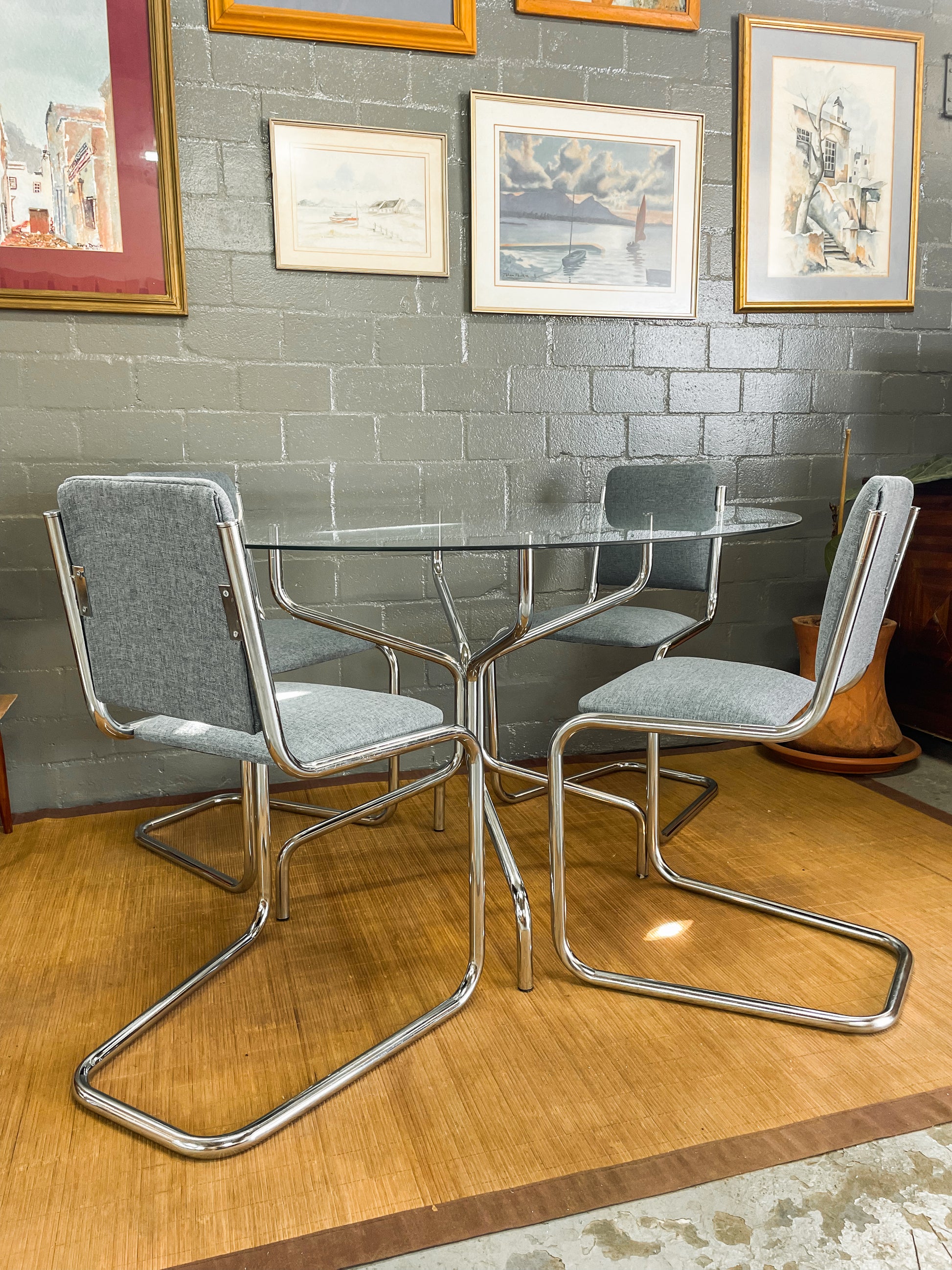 Upgrade your dining space with this exquisite vintage dining set. The set features four Cesca style chairs, each meticulously reupholstered in luxurious double-lined blue canvas for added comfort and sophistication. Paired with a sleek glass top table adorned with a chrome frame, this ensemble exudes timeless elegance. The chrome frames, in impeccable condition, have been meticulously cleaned and polished to a radiant shine, ensuring both durability and aesthetic appeal for years to come.