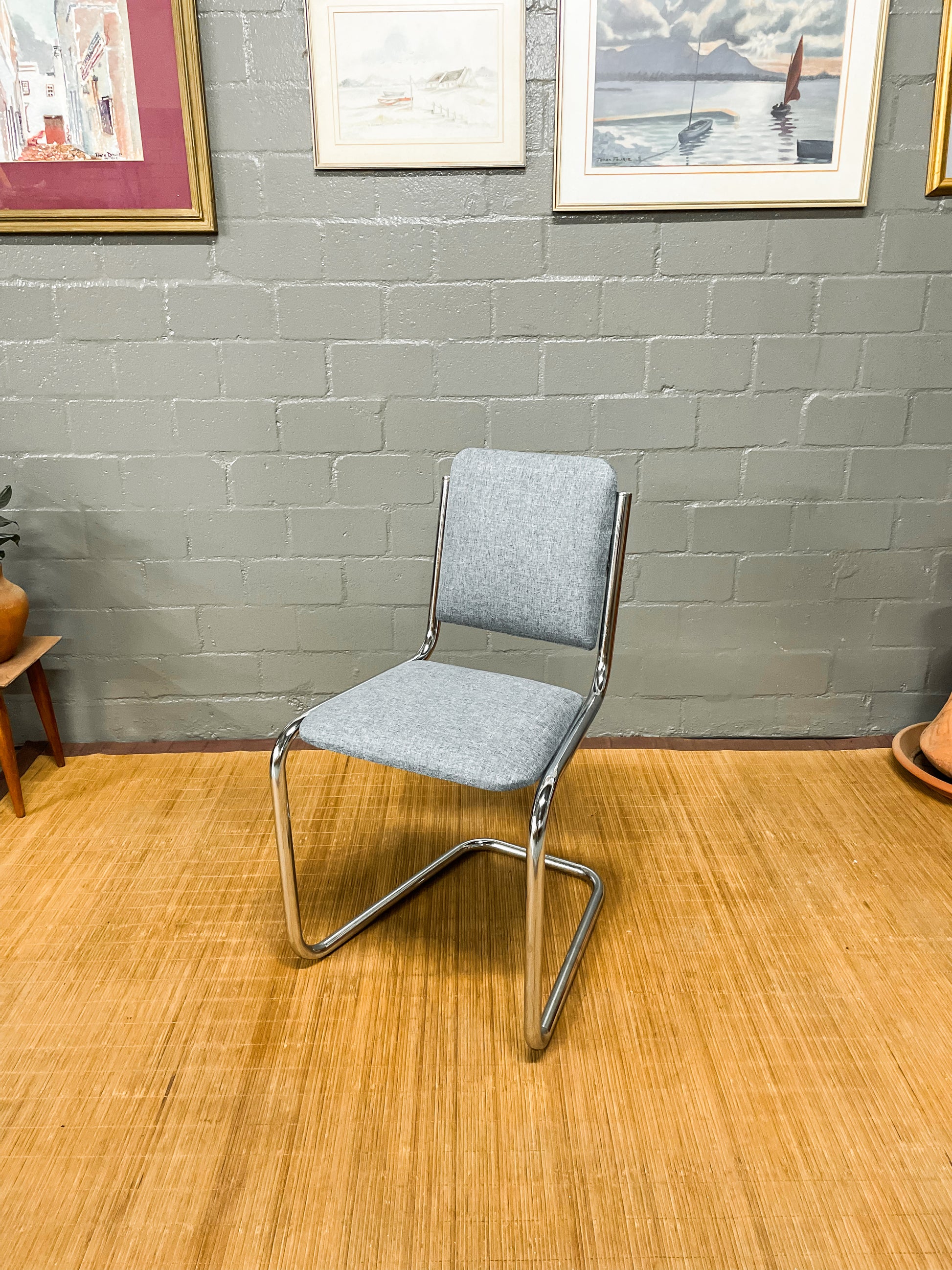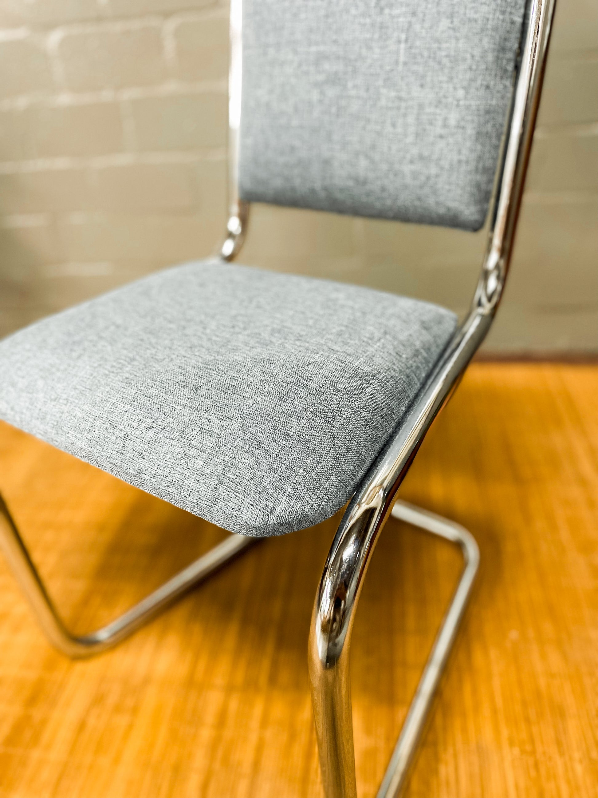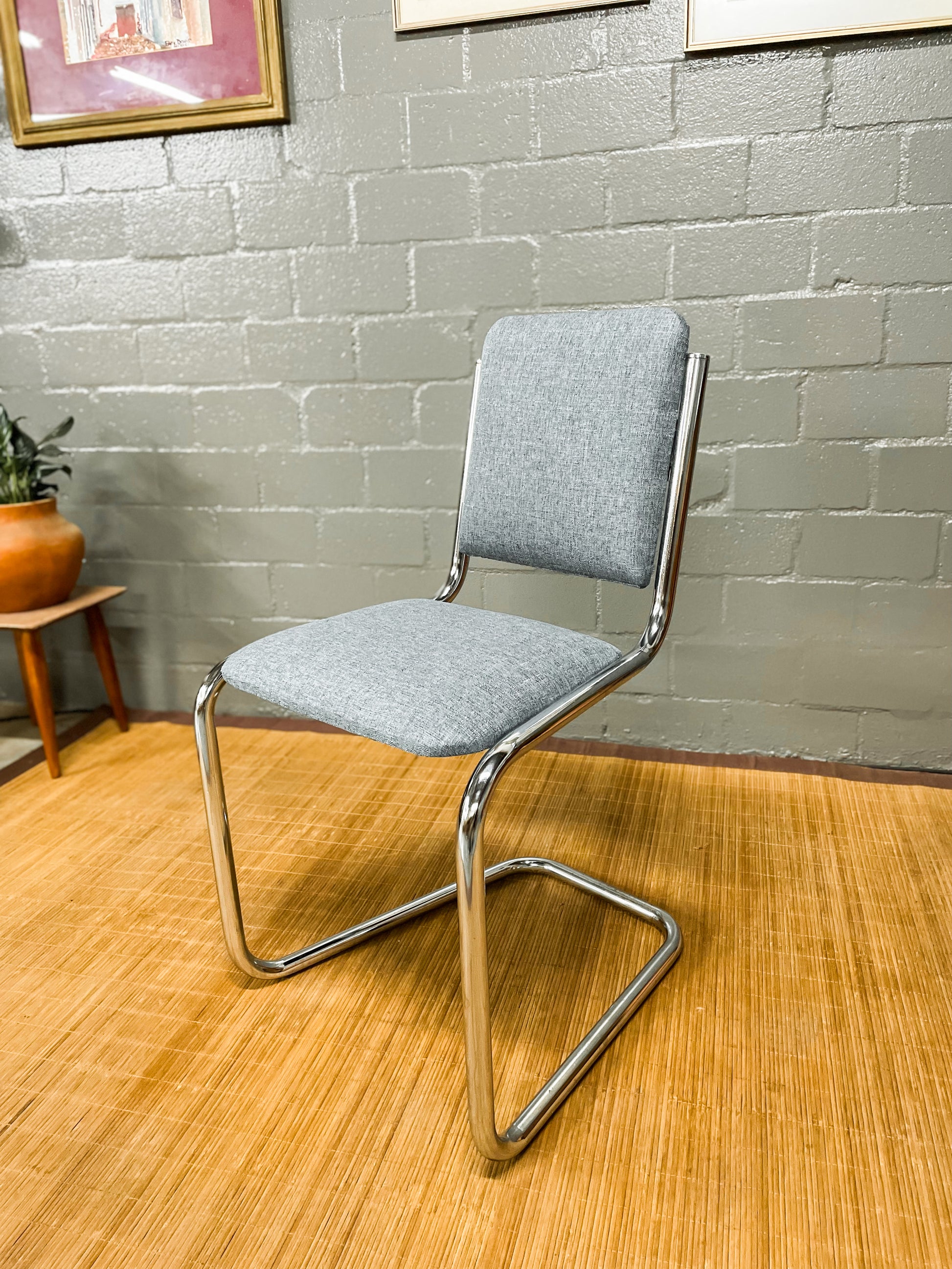 Upgrade your dining space with this exquisite vintage dining set. The set features four Cesca style chairs, each meticulously reupholstered in luxurious double-lined blue canvas for added comfort and sophistication. Paired with a sleek glass top table adorned with a chrome frame, this ensemble exudes timeless elegance. The chrome frames, in impeccable condition, have been meticulously cleaned and polished to a radiant shine, ensuring both durability and aesthetic appeal for years to come.