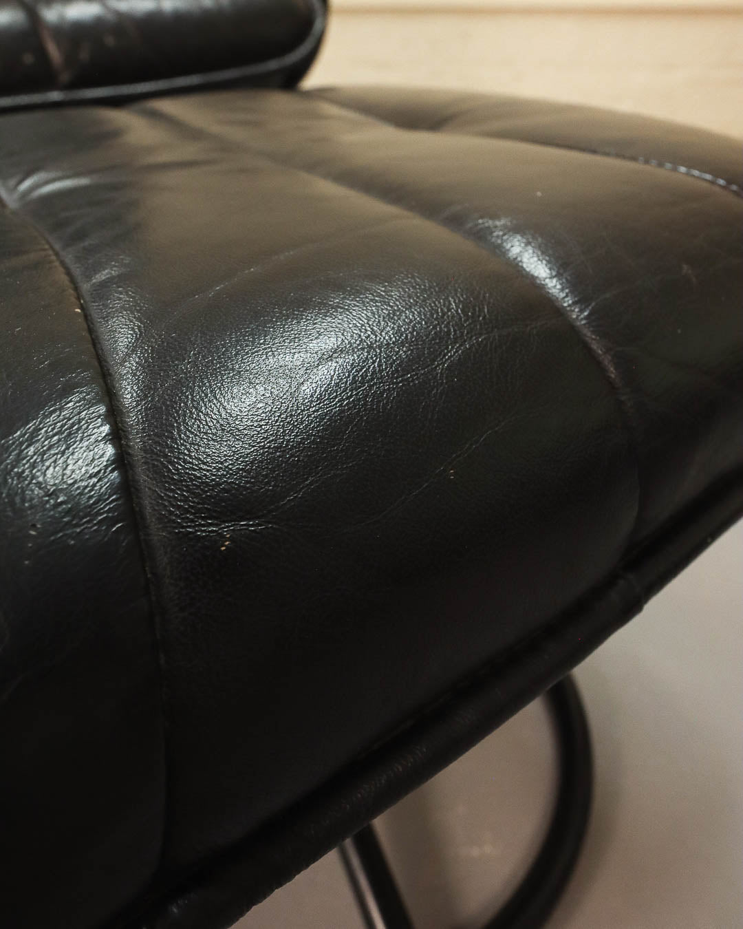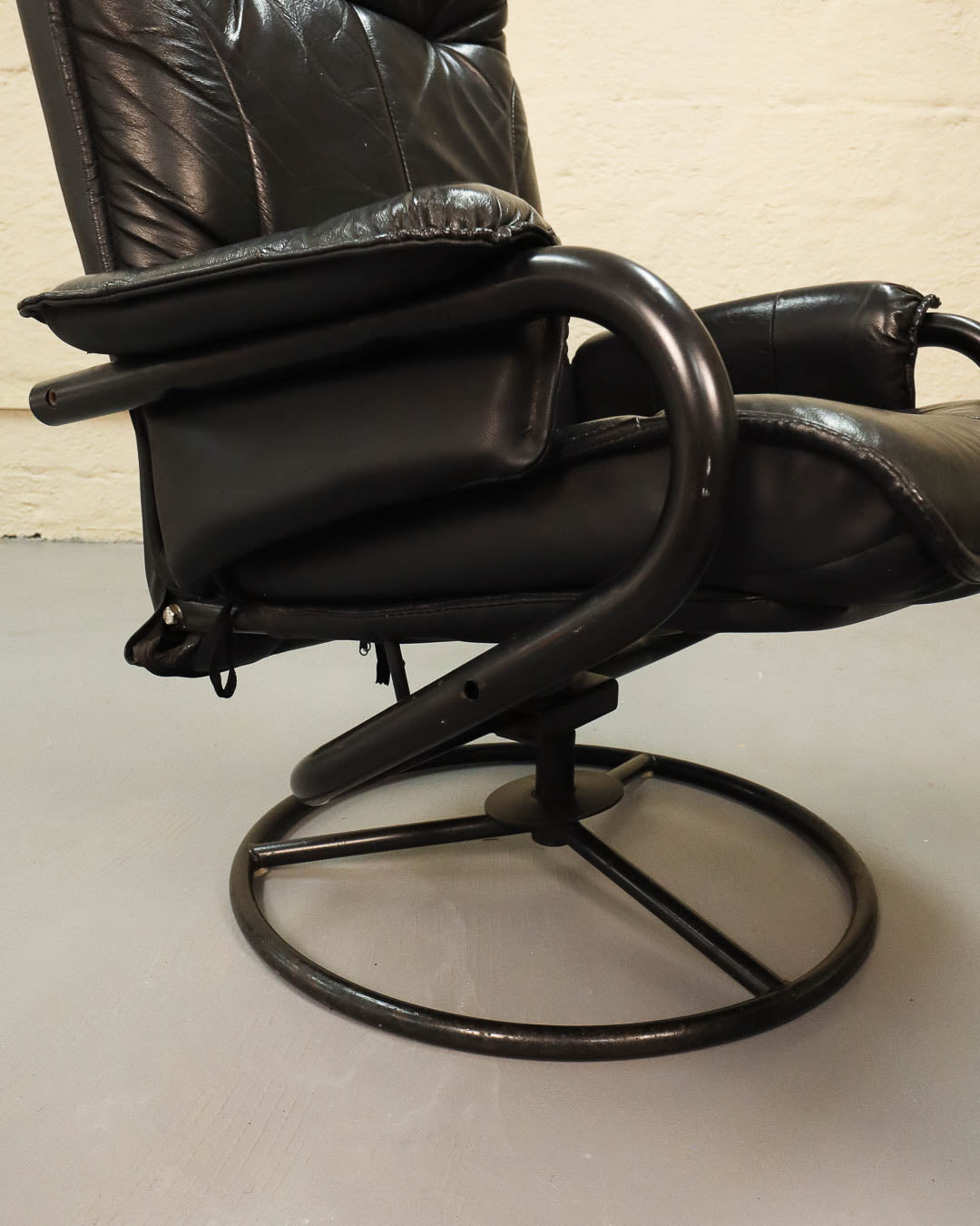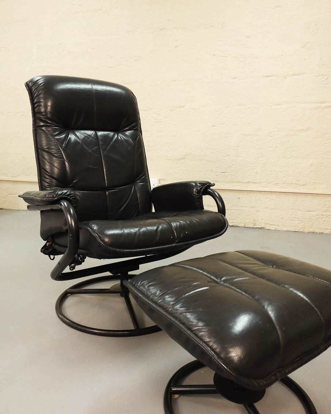 Stunning vintage leather recliner with matching footstool, possibly crafted by ChairWorks, renowned for their high-quality, timeless furniture. This set is in excellent condition, free from tears or damage. The recliner’s push-back mechanism allows you to effortlessly transition from an upright position to fully reclined, ideal for long reading sessions or moments of relaxation after a long day. The chair has been cleaned and conditioned, and its reclining mechanism carefully oiled to ensure smooth, easy operation. Ideal for your home office, library, or living room, this classic and comfortable chair will quickly become your favourite spot to unwind.