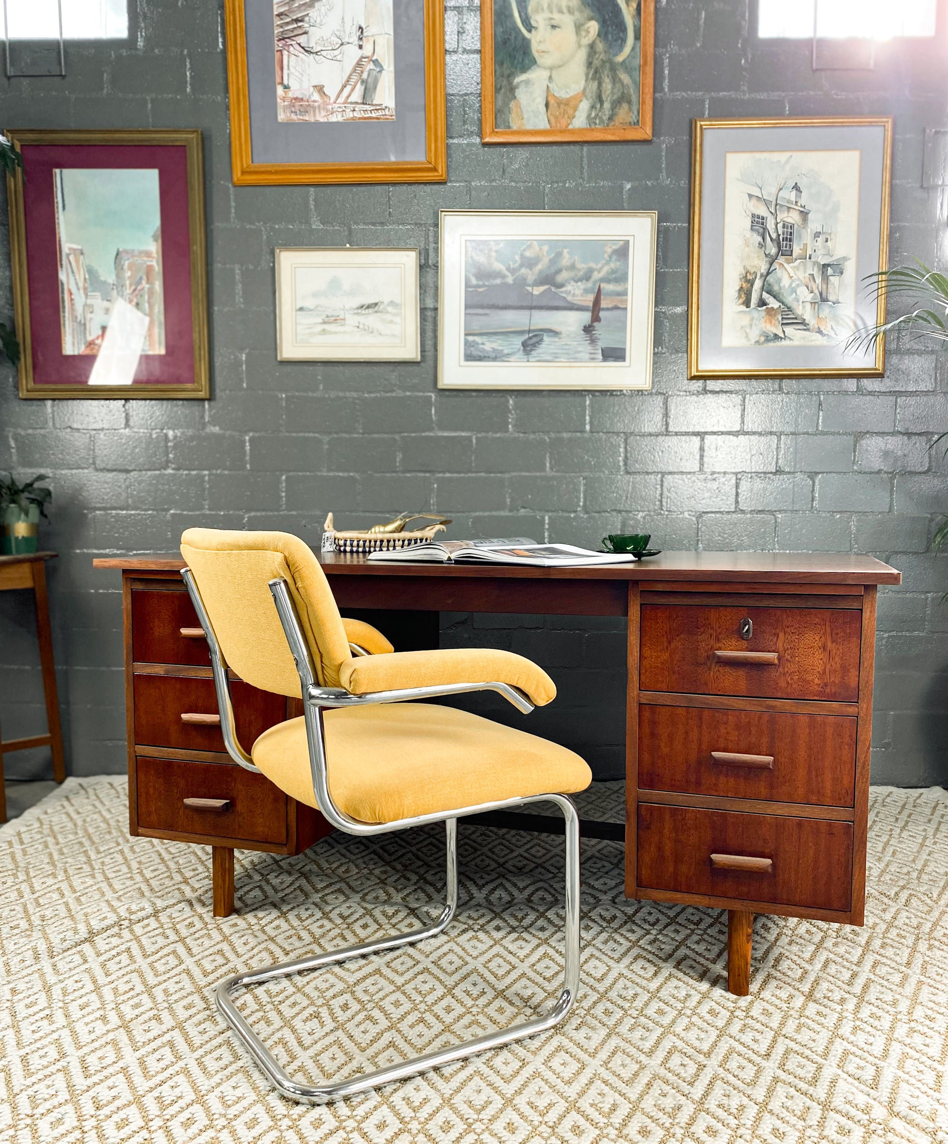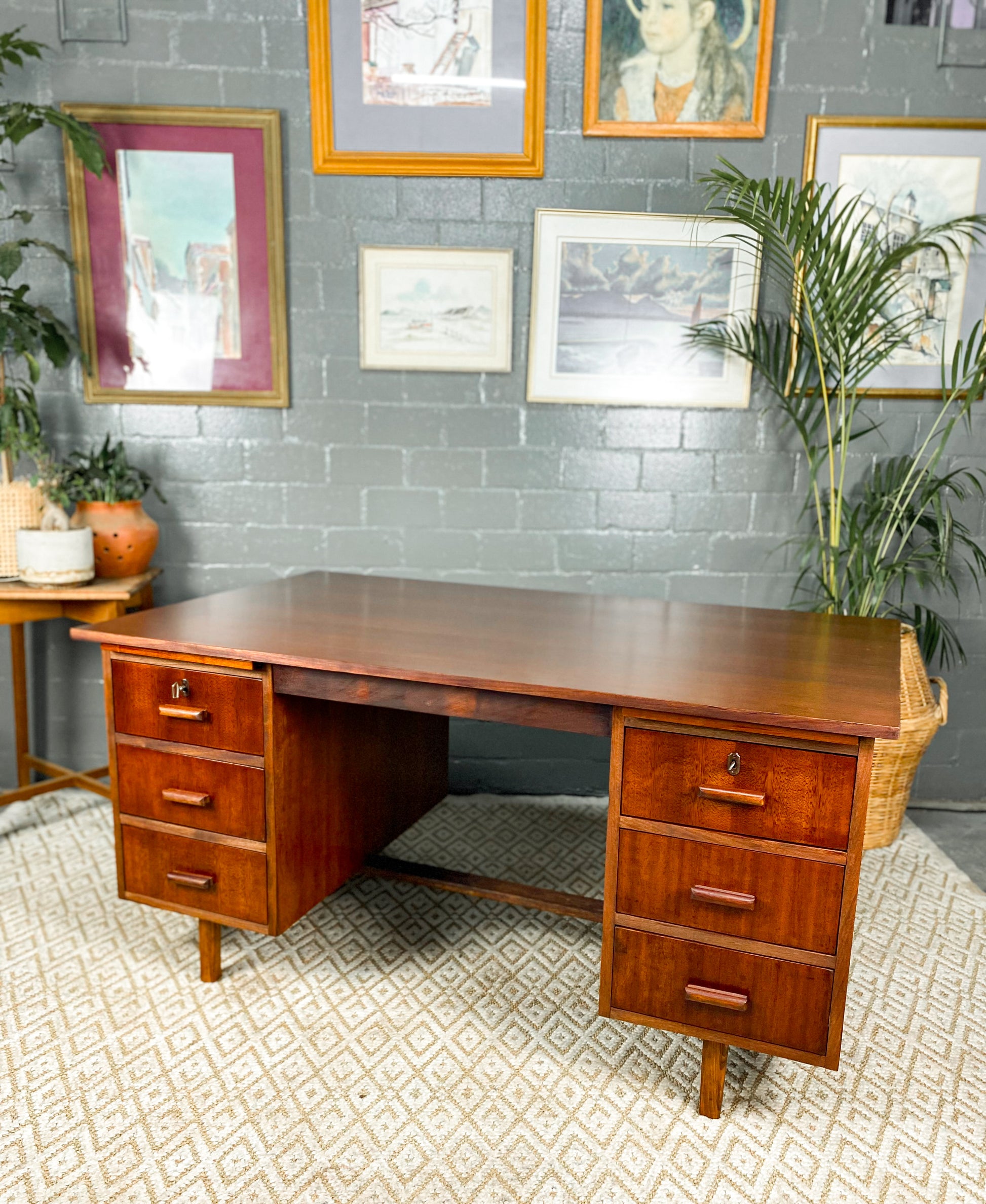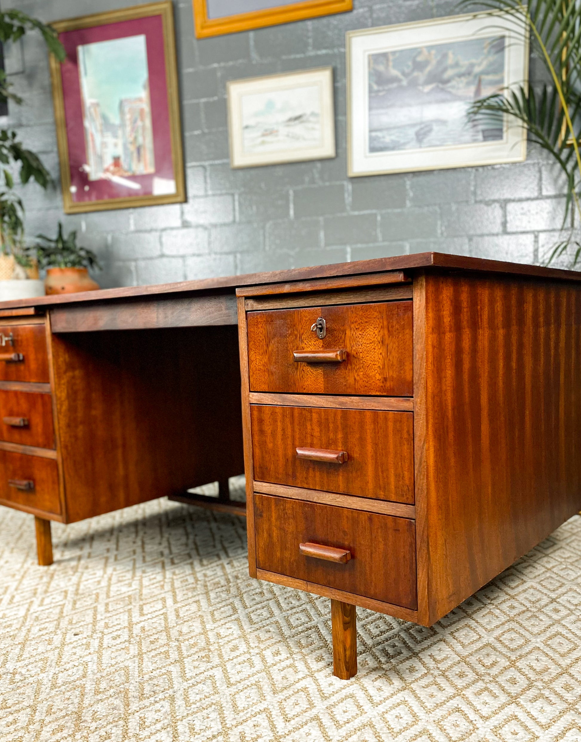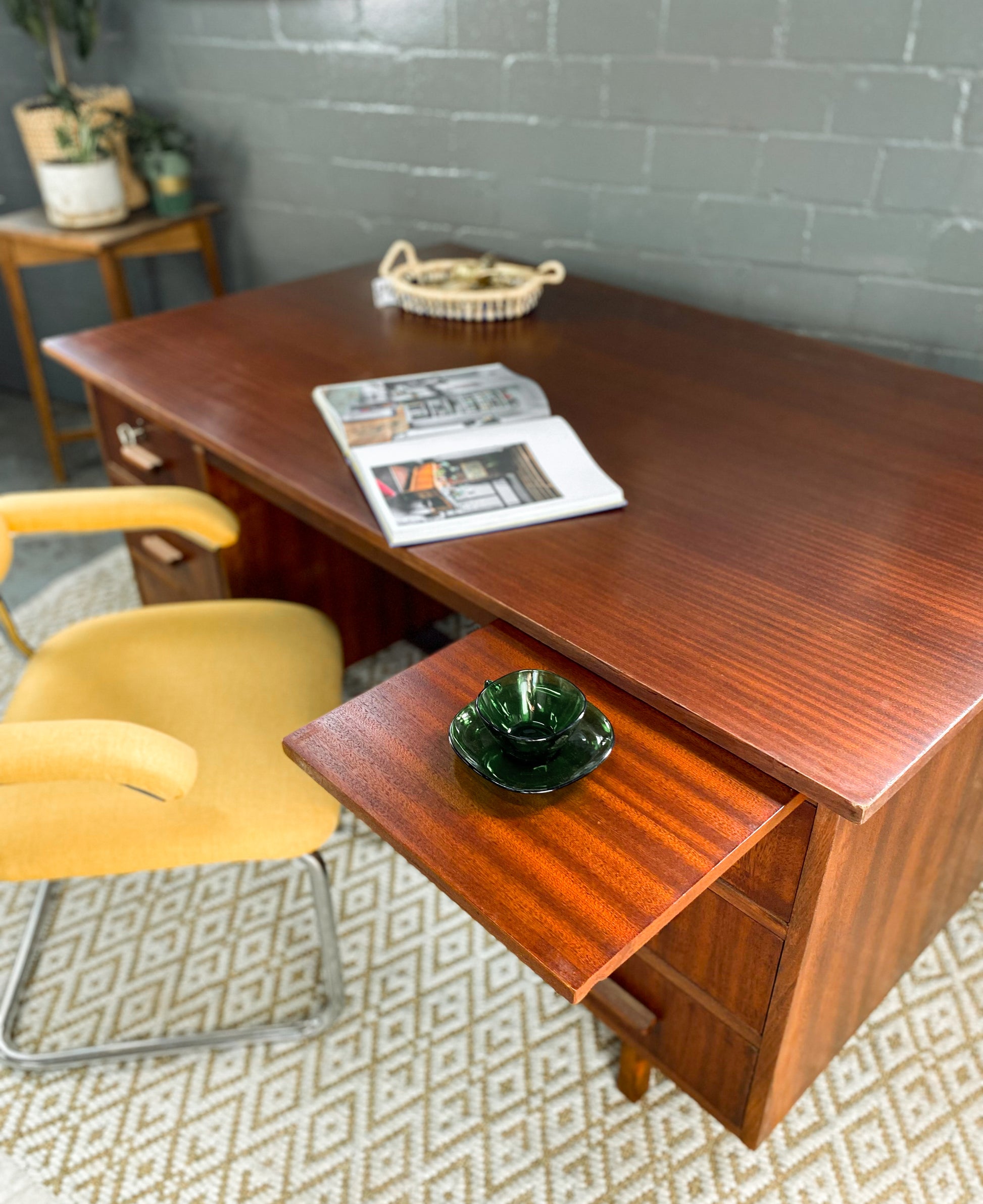 The wood has been meticulously restored and sealed, preserving its rich teak finish and ensuring it remains in excellent vintage condition. The desk is also stunning from the back, allowing it to be positioned anywhere in the room. Its design even accommodates seating for an additional person if needed, making it a versatile addition to any workspace.