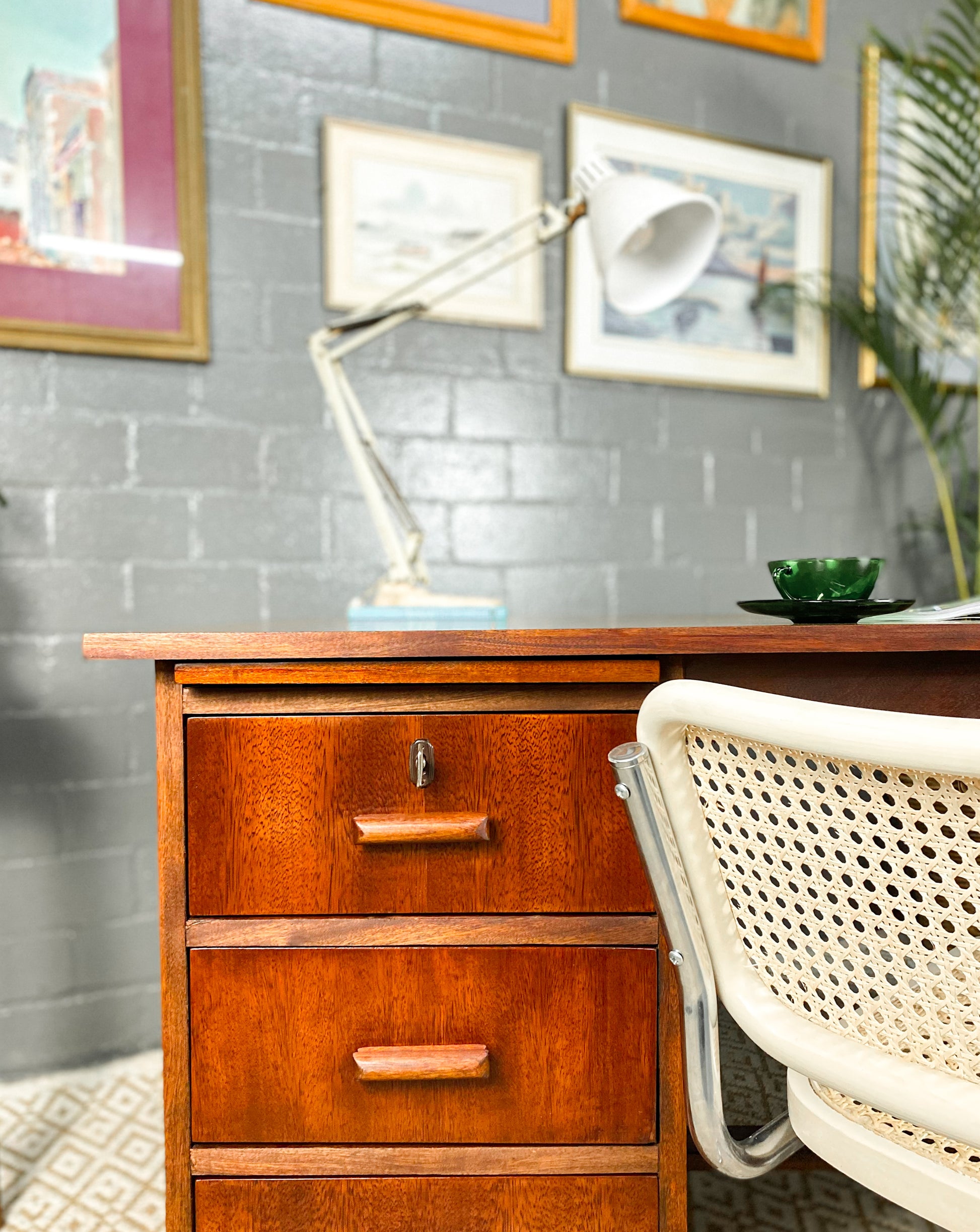 Elevate your office or study area with this stunning vintage teak desk. Featuring a spacious surface area and abundant storage with six drawers, this desk ensures you have plenty of room to work and organise your essentials. The pull-out trays on either side offer extra workspace, while the built-in wooden footrest adds to your comfort. Crafted from a combination of solid wood and veneer, this desk is as functional as it is beautiful.