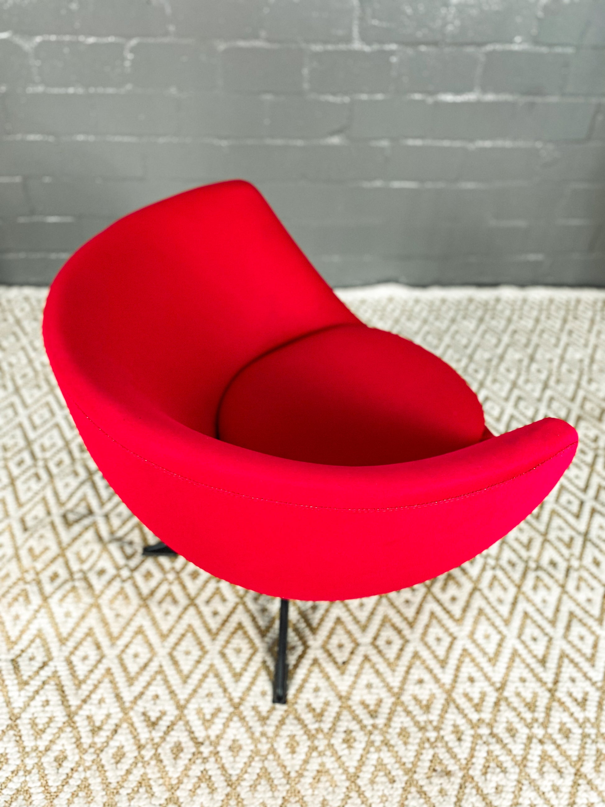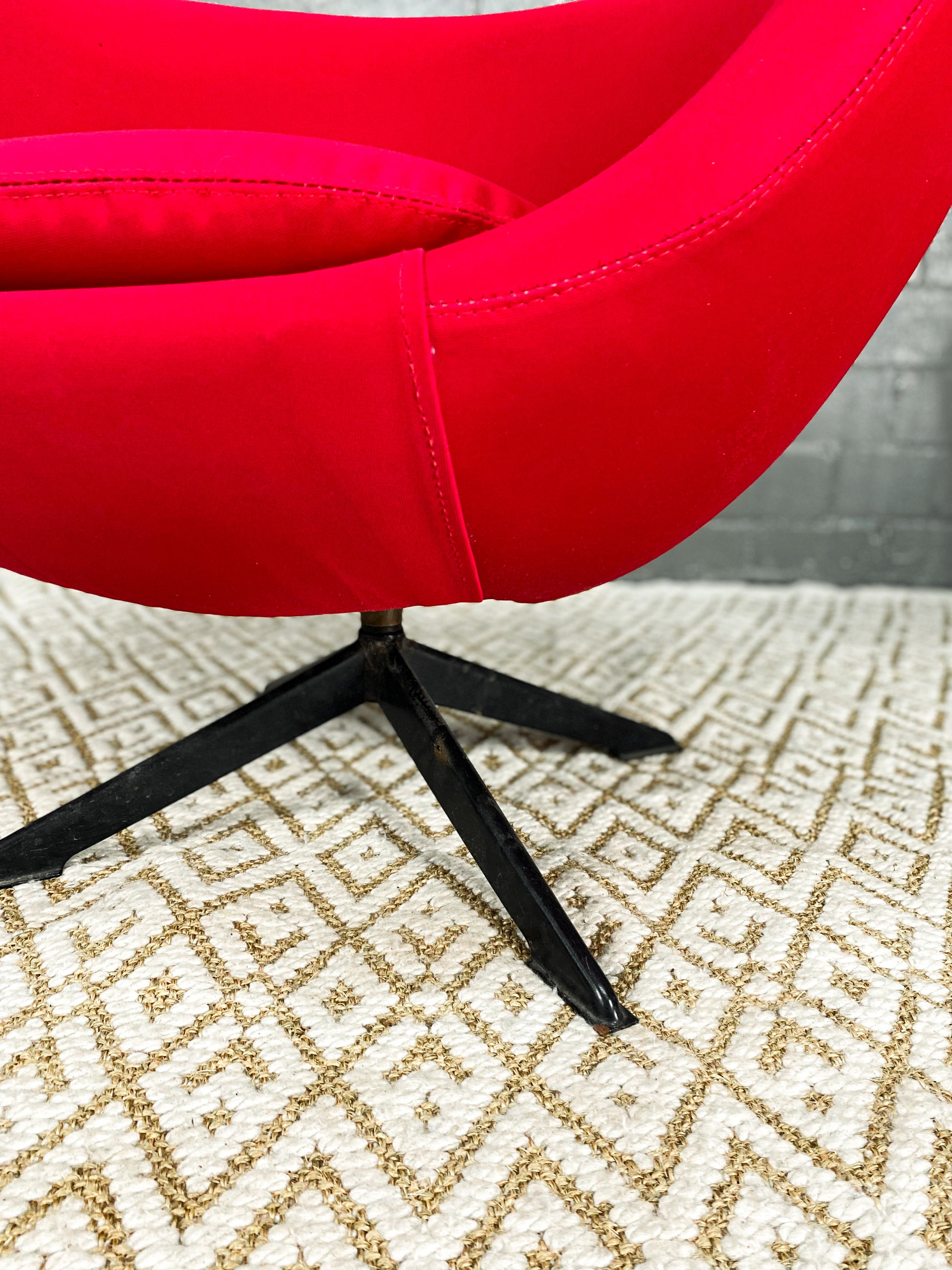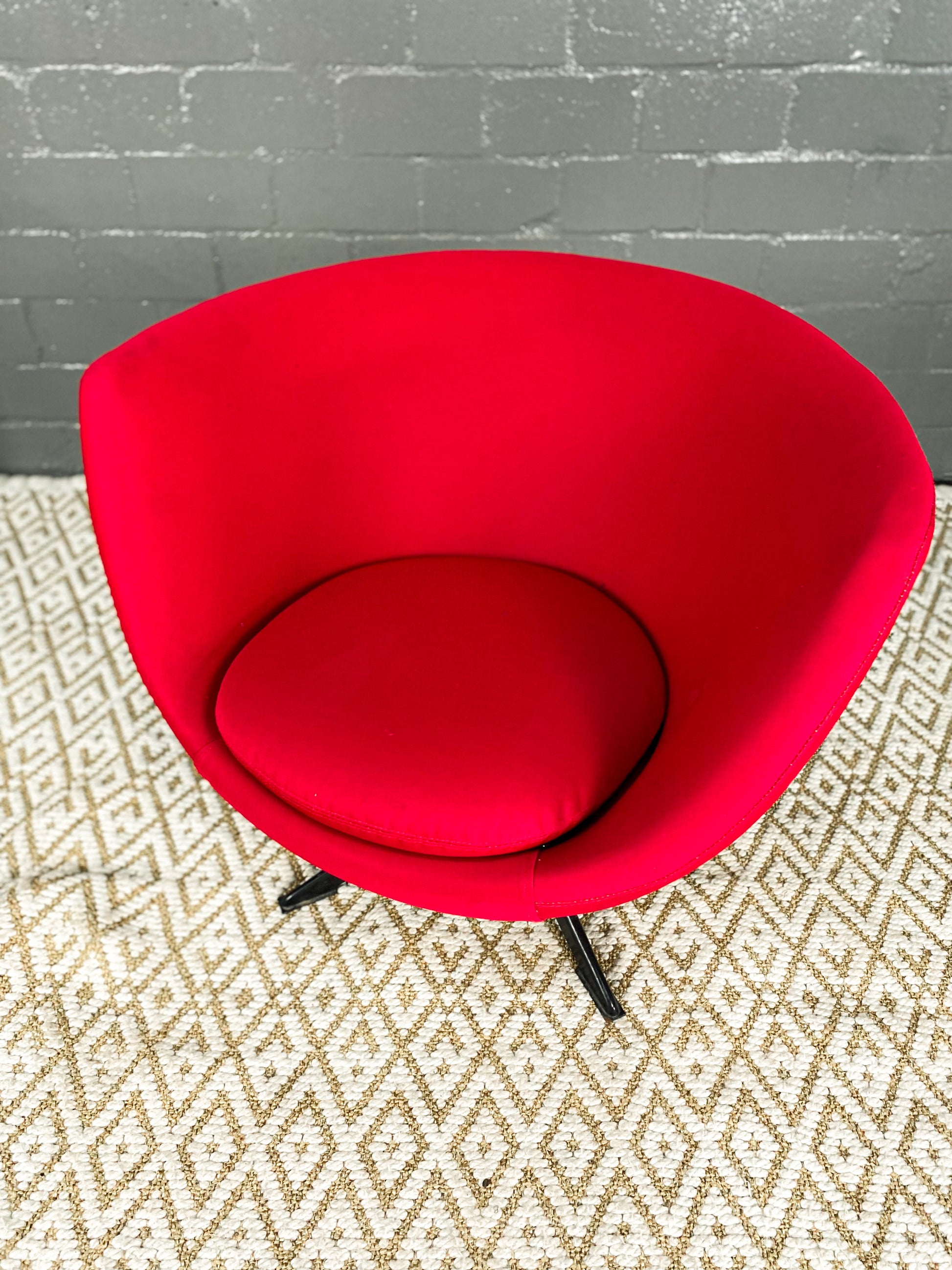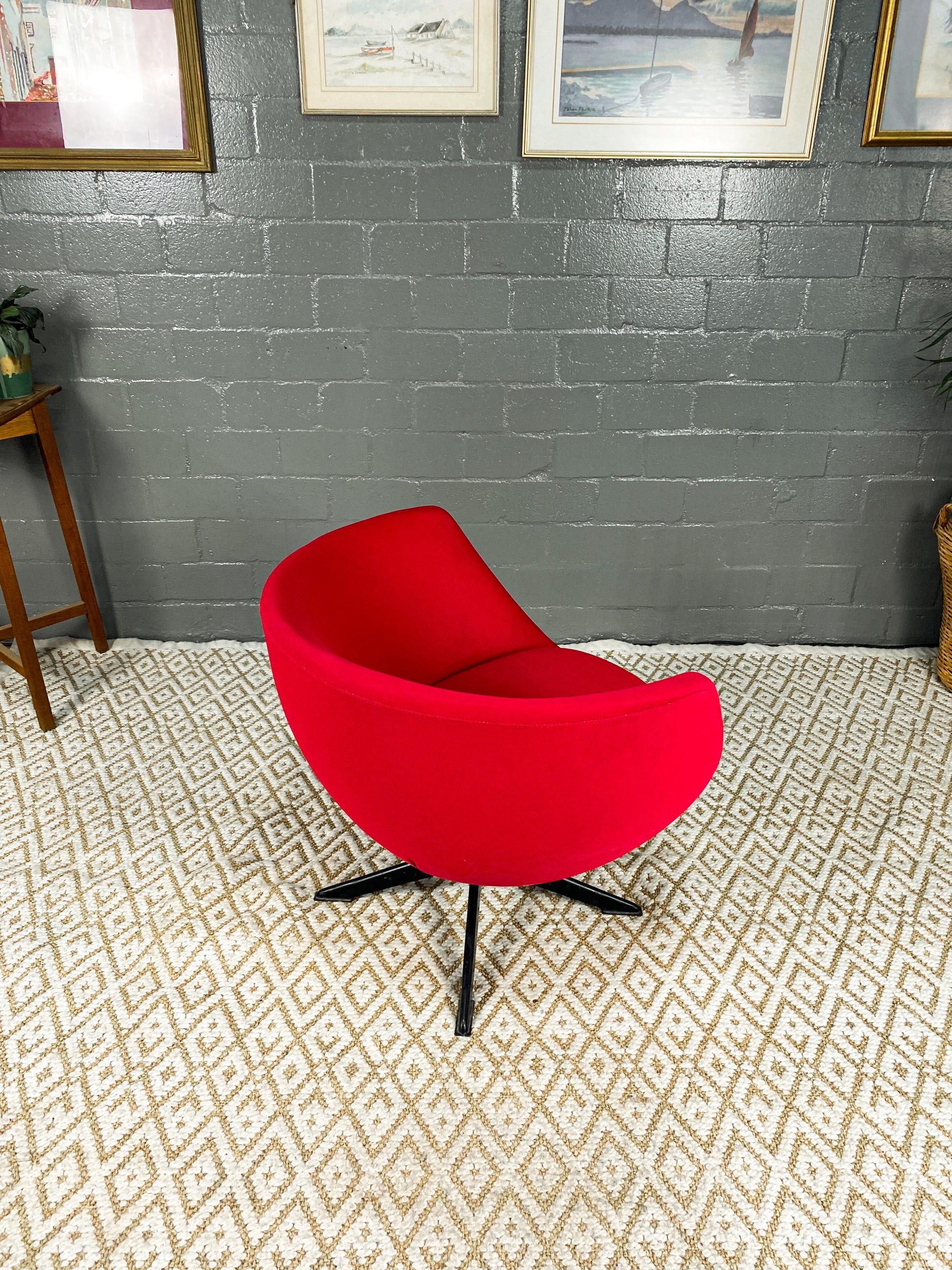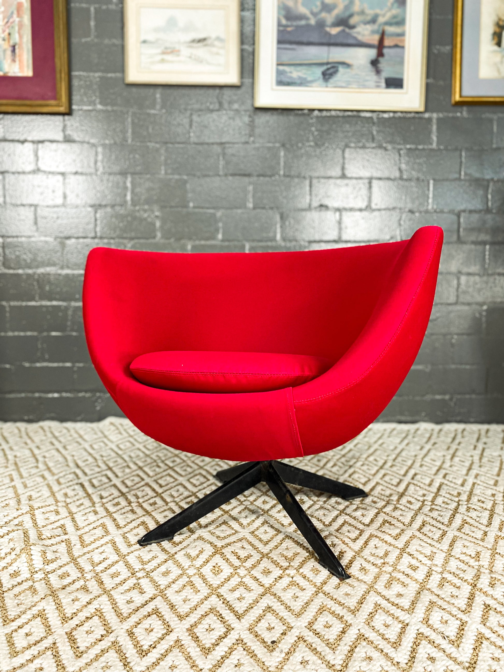 This iconic Zodiac chair, named after their manufacturer, embody the quintessential 1960s style. Featuring a swivel design, a tub chair with a separate seat cushion, and a cylindrical steel column with four rectangular legs, these chairs are a retro masterpiece. The piece remains in its original condition, showcasing age-related scuffs on both the upholstery and the frame, preserved to honour its timeless design and rich history.